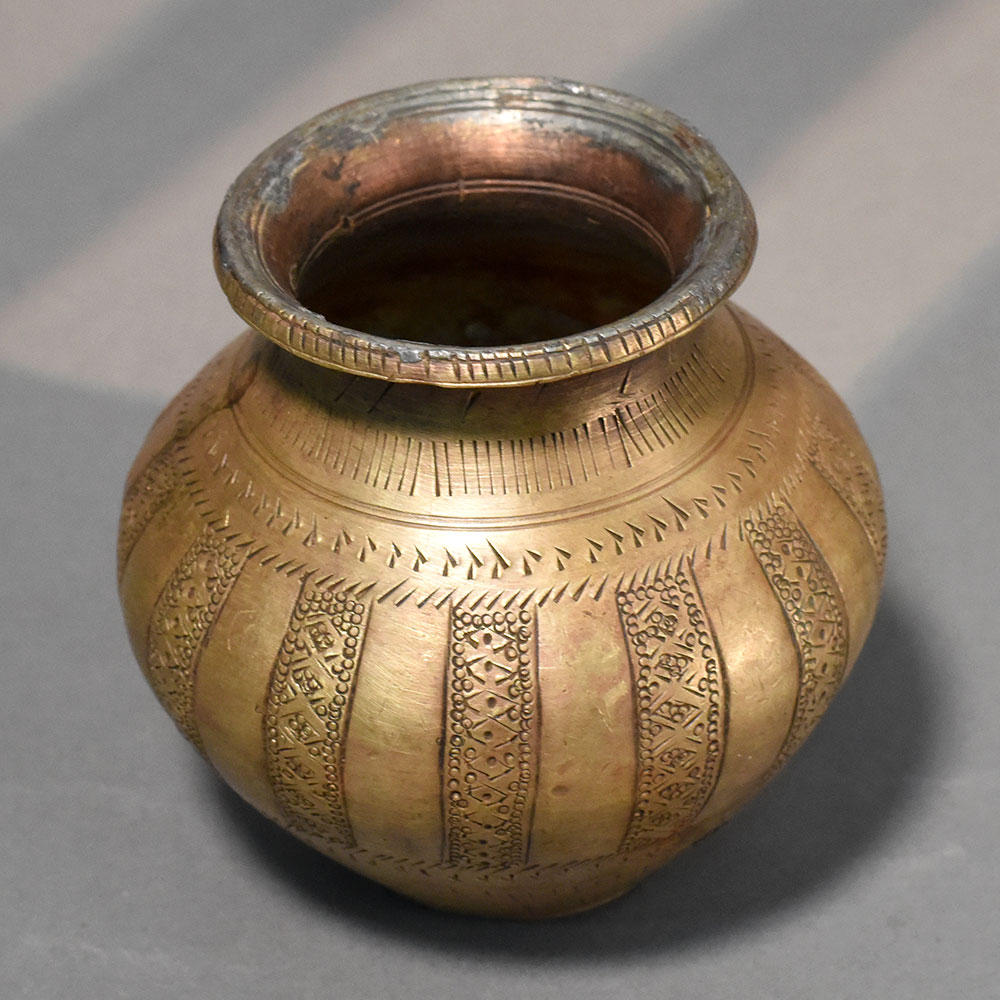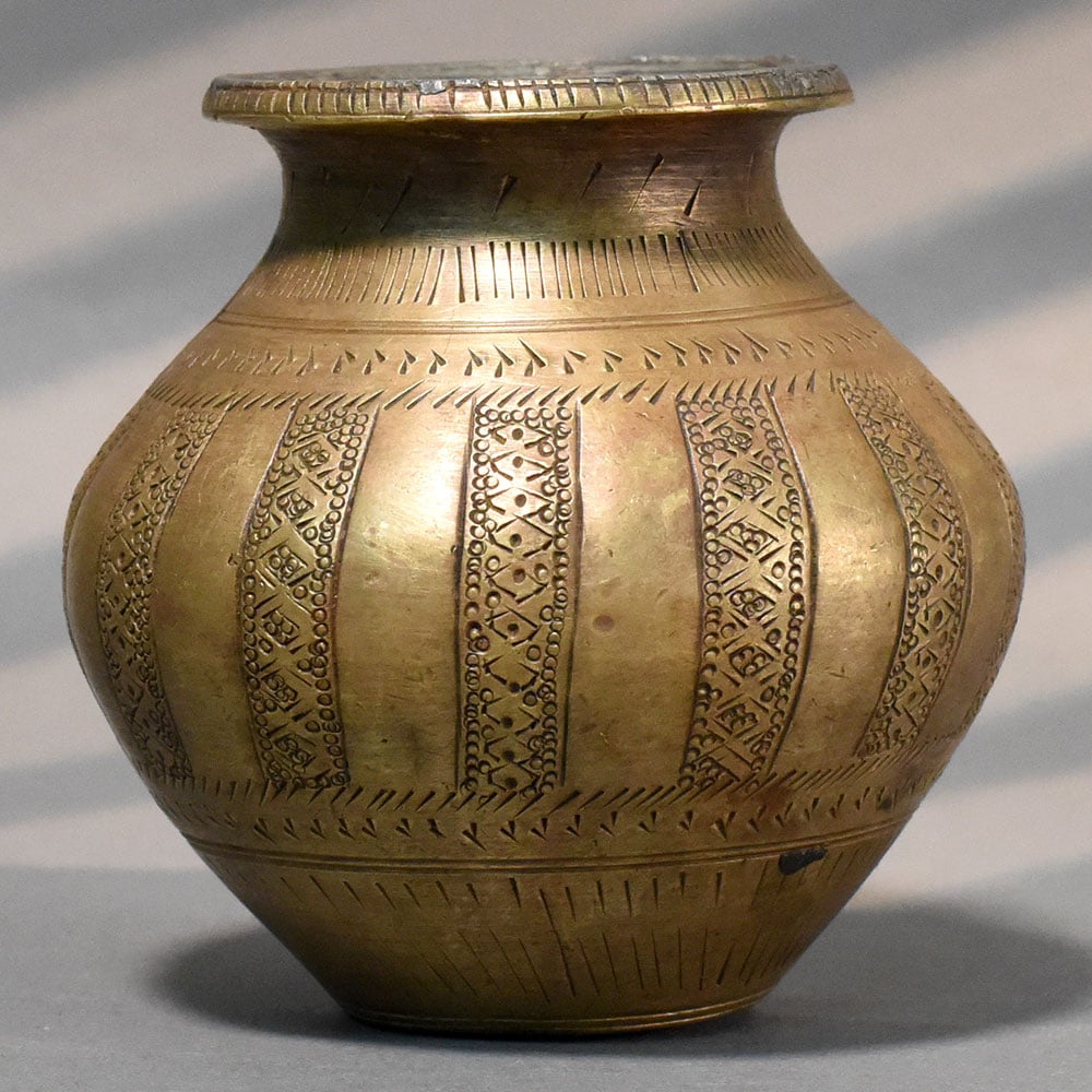 This handcrafted brass detailed engraved traditional ritual pot is a striking example of Indian artisanal metalwork, defined by its bold patterns and well-balanced form. The rounded body, wide neck, and sturdy base come together to create a vessel that is both visually rich and functionally versatile. The surface features intricate vertical engraved panels, each filled with geometric and dotted motifs that add depth and rhythm to the design. These hand-etched details reflect traditional craftsmanship techniques, giving the pot a textured, layered appearance that stands out beautifully in any setting. Crafted from solid brass, the piece carries a warm, earthy tone enhanced by subtle variations and natural aging marks. These characteristics highlight its handmade nature and add to its authenticity. The wide opening makes it easy to use for holding water, flowers, or ritual offerings, while its solid base ensures stability during use. Traditionally used in pooja rituals, temple ceremonies, and festive occasions, this pot also serves as a decorative centerpiece for heritage-inspired interiors. Its detailed engravings and classic silhouette make it ideal for display on altars, shelves, or as part of a curated brass collection. Perfect for those who appreciate handcrafted decor with cultural significance, this engraved brass pot combines tradition, artistry, and timeless appeal.