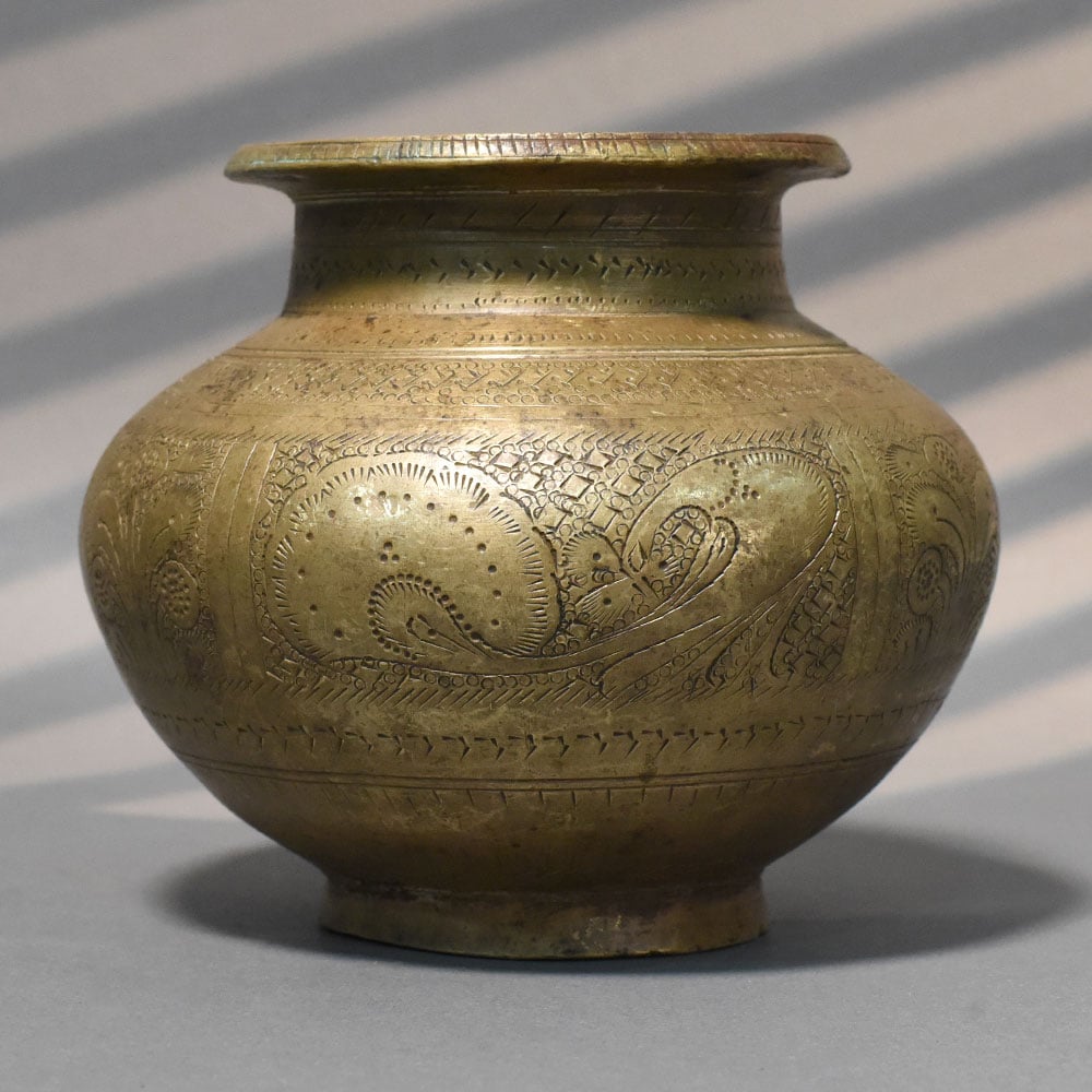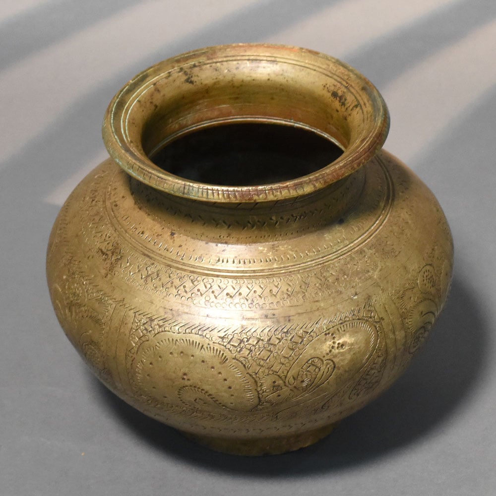 This handcrafted brass engraved kalash traditional decorative vessel showcases intricate surface detailing that reflects skilled metal artistry. The rounded body is enhanced with engraved motifs, adding visual depth while maintaining the classic kalash form used in Indian rituals. Made from solid brass, the vessel features a naturally aged finish that highlights the fine hand-etched patterns. The engraved designs bring texture and character to the surface, while the wide neck and rim ensure practical usability during rituals. Traditionally used in pooja ceremonies, sacred water storage, and festive rituals, this kalash carries cultural and spiritual importance. The broad base provides stability, while the spacious body allows sufficient capacity for offerings or ritual use. The detailed craftsmanship also makes it suitable as a decorative accent, blending effortlessly into traditional interiors or adding a heritage touch to modern spaces. The engraved patterns create a refined aesthetic without overwhelming the overall design. Ideal for spiritual use, gifting, or collectors of traditional brassware, this kalash combines craftsmanship, functionality, and timeless appeal.