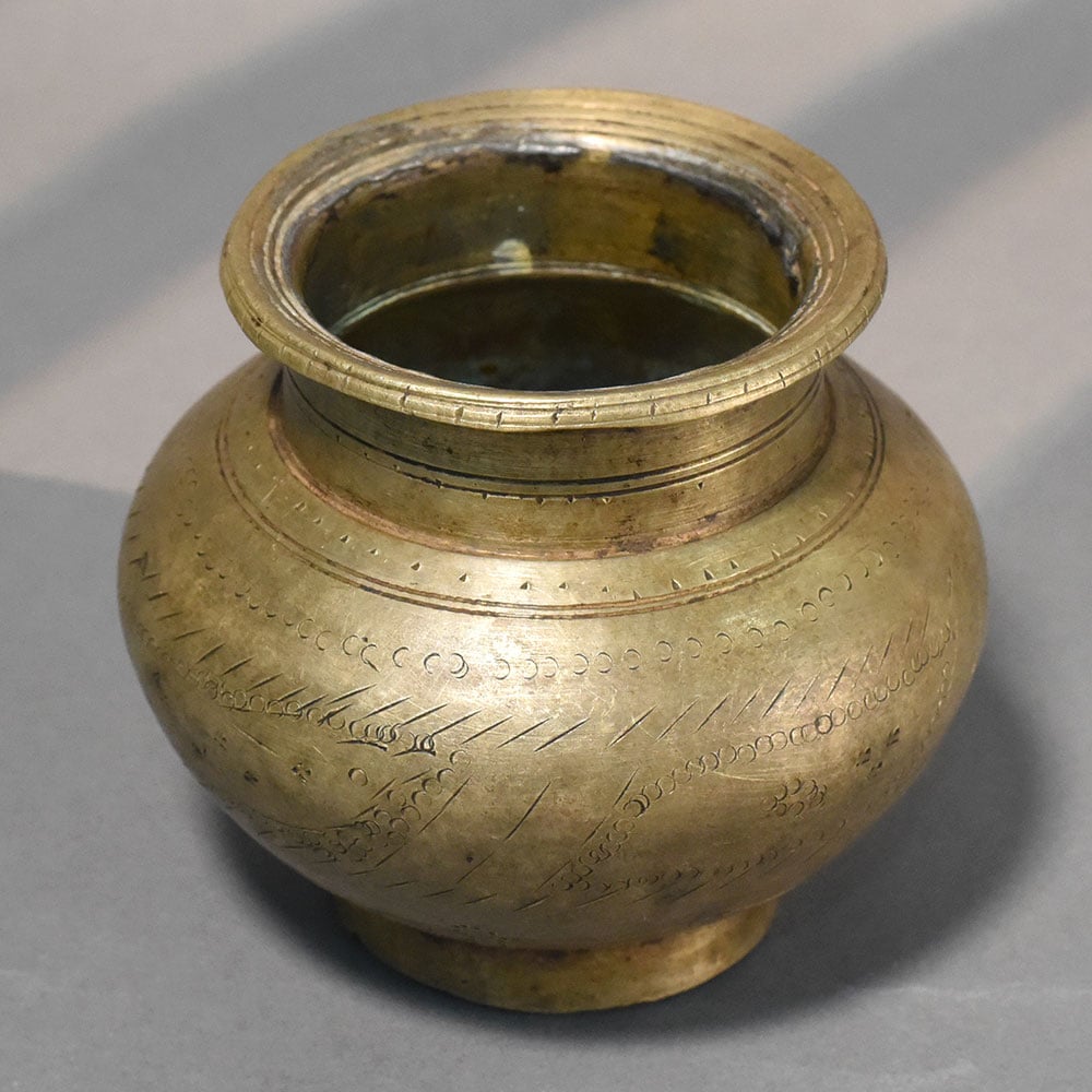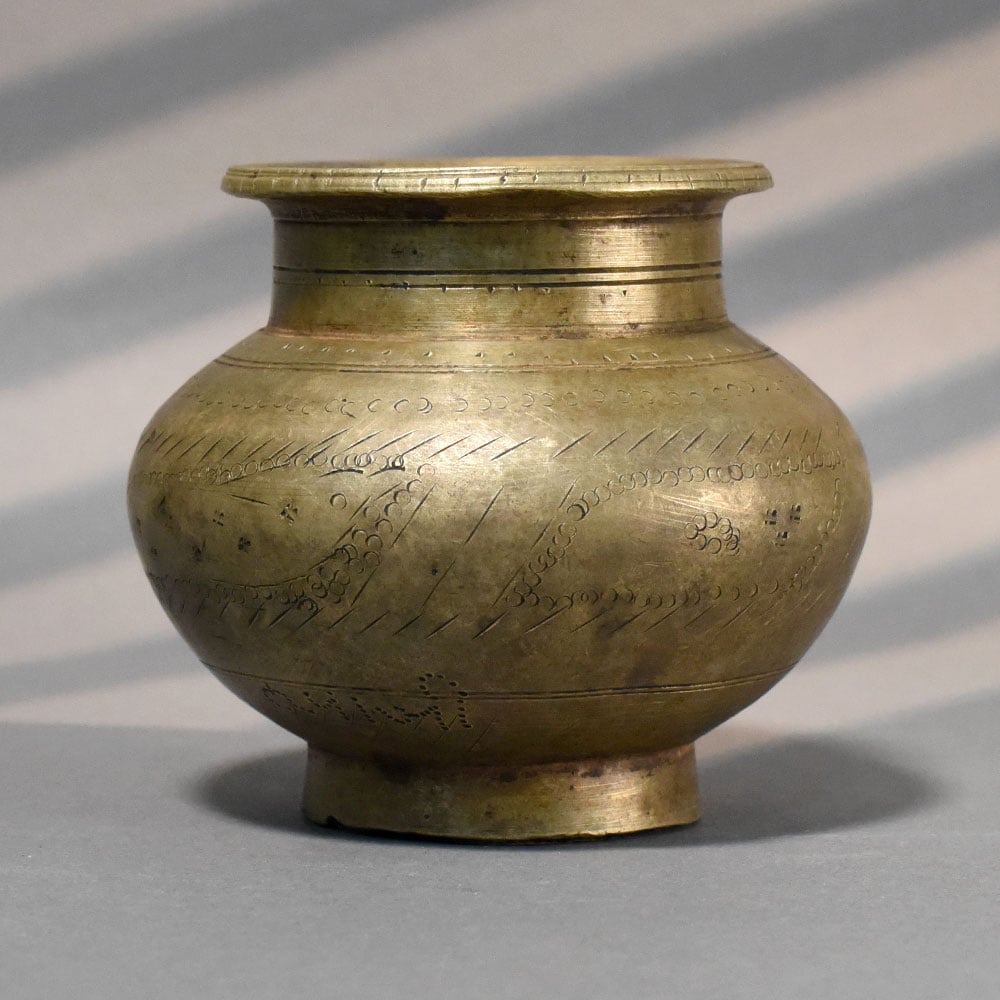 This handcrafted brass etched traditional ritual storage pot is a timeless piece that reflects the depth and beauty of Indian metal craftsmanship. With its rounded silhouette, wide mouth, and finely detailed surface, this vessel blends practical functionality with subtle decorative artistry. The body of the pot is adorned with delicate etched patterns, including linear textures and traditional motifs that add visual rhythm and handcrafted character. These engravings are manually created, giving each piece a unique identity and a sense of authenticity that machine-made items cannot replicate. Crafted from solid brass, the vessel carries a warm golden tone with natural variations and gentle aging marks. The wide opening allows for ease of use, making it suitable for storing water, flowers, or ritual offerings. Its balanced proportions and sturdy base ensure stability, whether used daily or displayed as a decorative object. Traditionally used in pooja rituals, temple ceremonies, and spiritual practices, this pot also serves as an elegant decor accent. Its understated detailing makes it versatile enough to complement both heritage and modern interiors, adding warmth and cultural depth to any space. Perfect for collectors and those who appreciate handcrafted metalware, this etched brass pot stands as a meaningful blend of tradition, design, and enduring craftsmanship.