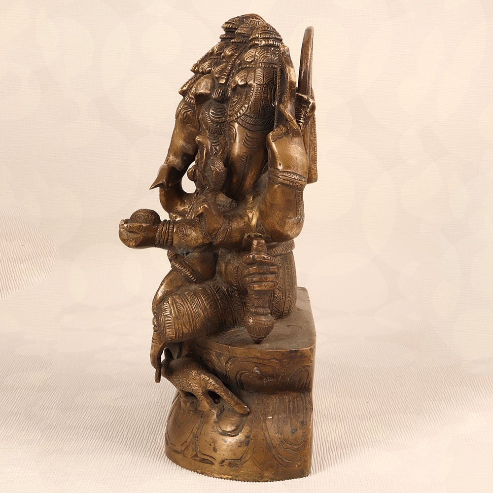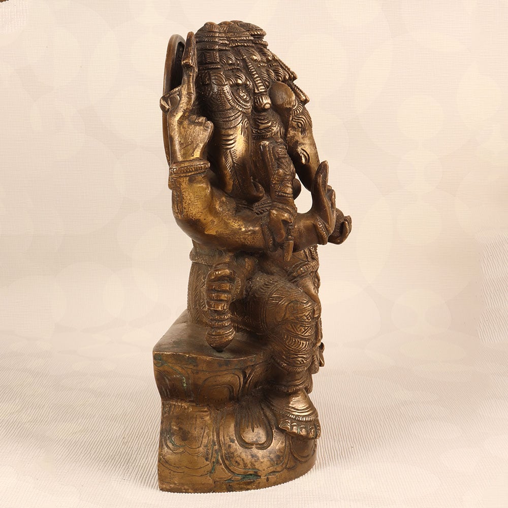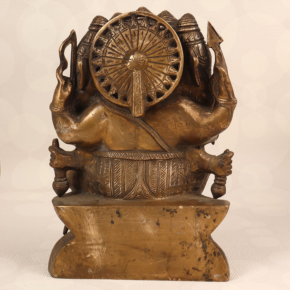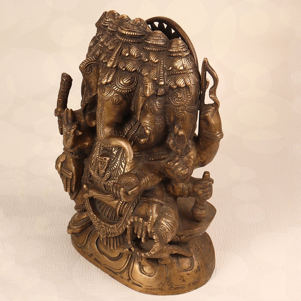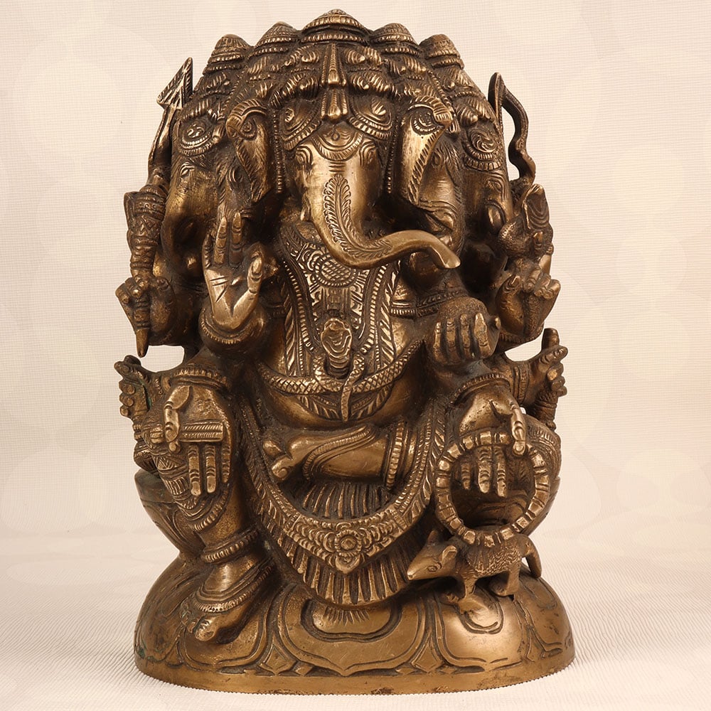 Decorate your space with the timeless charm of our Vintage Brass Lord Ganesha Statue. Meticulously crafted by highly talented Indian artisans, this exquisite piece features the iconic deity with five heads, showcasing a divine representation of Lord Ganesha. The statue boasts an antique brown finish, adding a touch of antiquity and sophistication to any setting. Handmade with precision from high-quality brass, this statue radiates an aura of authenticity and cultural richness. Perfect for adorning your home, office, restaurant, hotel, or cafe prayer room, it serves as a symbol of prosperity, wisdom, and auspicious beginnings. Enhance your vintage collection with this unique masterpiece that seamlessly blends traditional craftsmanship with artistic elegance. The Vintage Brass Lord Ganesha Statue also makes for a thoughtful and meaningful gift for your loved ones on special, festive, or auspicious occasions, conveying blessings and positive energy to their lives.