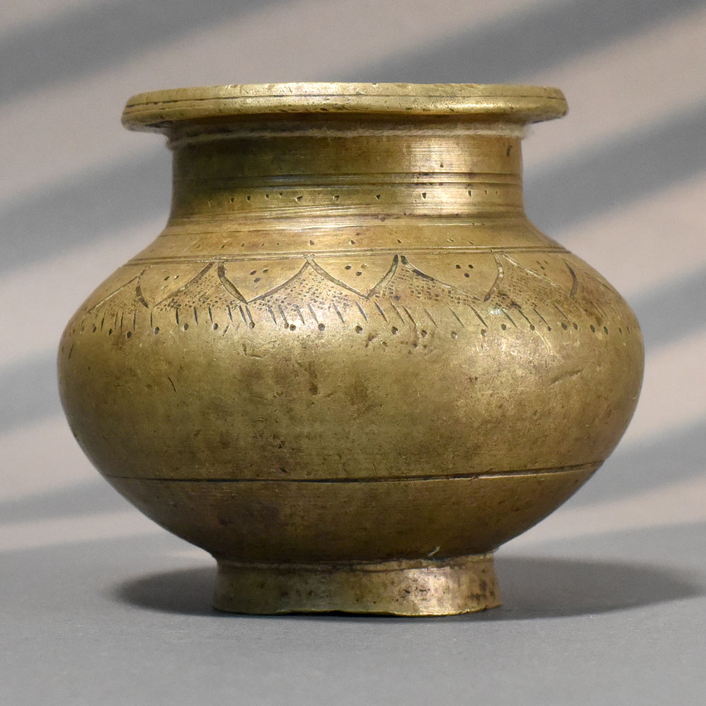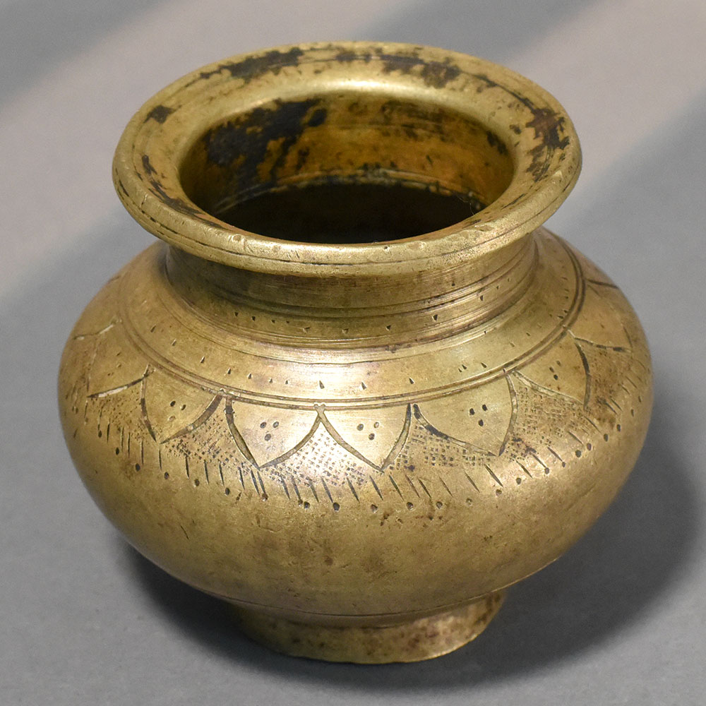 This handcrafted brass floral etched traditional ritual pot is a beautiful blend of simplicity and decorative craftsmanship, designed to reflect the essence of traditional Indian metalwork. Its rounded form, wide mouth, and compact base create a balanced silhouette that is both functional and visually appealing. The pot is enhanced with subtle floral-inspired etched patterns along the upper body, adding a delicate ornamental touch without overpowering its classic shape. These hand-engraved details bring texture and character, showcasing the skill and precision of traditional artisans. Made from solid brass, the surface displays natural tonal variations and aged patina, which highlight its handcrafted origin. The slightly darkened inner rim and gentle surface wear add to its vintage charm, making it a piece that feels authentic and rooted in time. The wide opening allows easy use for holding water, flowers, or sacred offerings. Traditionally used in pooja rituals, temple ceremonies, and festive practices, this vessel also serves as a decorative accent in both traditional and modern interiors. Its understated detailing makes it versatile enough to complement a variety of styling themes while still carrying cultural depth. Ideal for collectors and those who appreciate handcrafted heritage decor, this brass pot offers a timeless presence that blends ritual significance with everyday elegance.