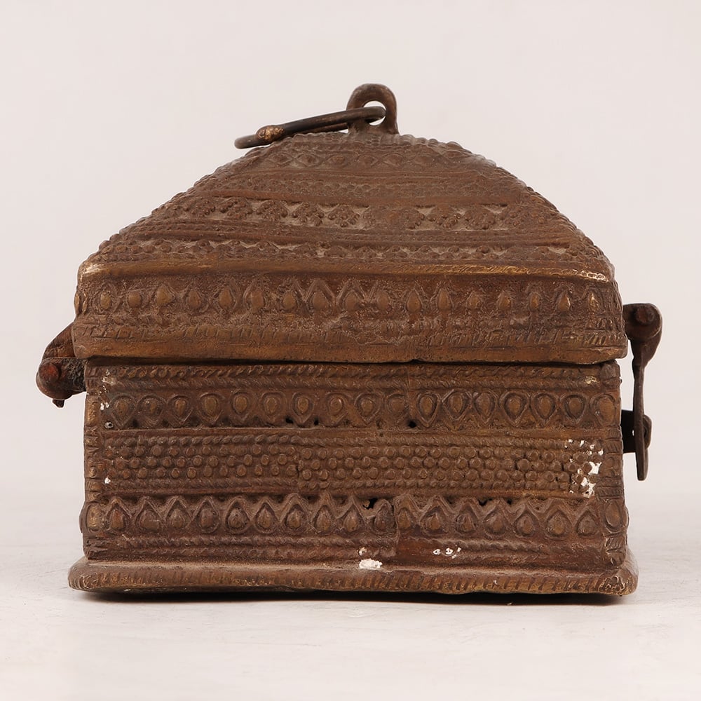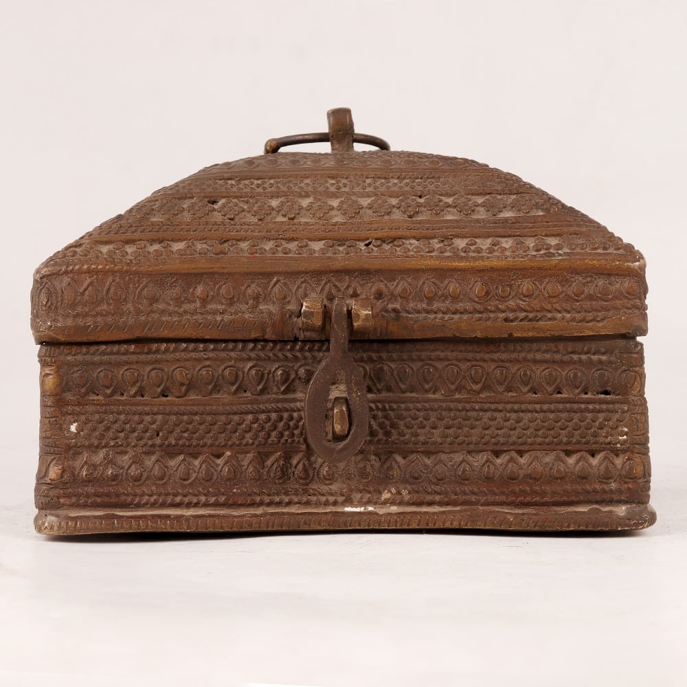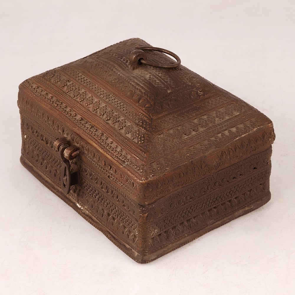 This vintage brass jewelry box exudes elegance and charm with its antique brown finish and intricate engraved patterns. Handmade by skilled Indian artisans, this box is a testament to the rich heritage of traditional metalwork. Its unique design features a secure latch and a sturdy handle on the top, adding a touch of nostalgia to any setting. Crafted from high-quality brass, this jewelry box is not just a decorative item but a functional storage solution for your precious stones, jewelry, or even treasured coins. Versatile in its application, this exquisite box can find its place in various settings, be it your home, office, restaurant, hotel, cafe, or shop, complementing the ambiance with its vintage allure. It is perfect for display at exhibitions or museums, adding a touch of history to the collection. Moreover, it makes for an ideal gift for your loved ones on special or festive occasions, making them feel cherished and appreciating the art of masterful craftsmanship.