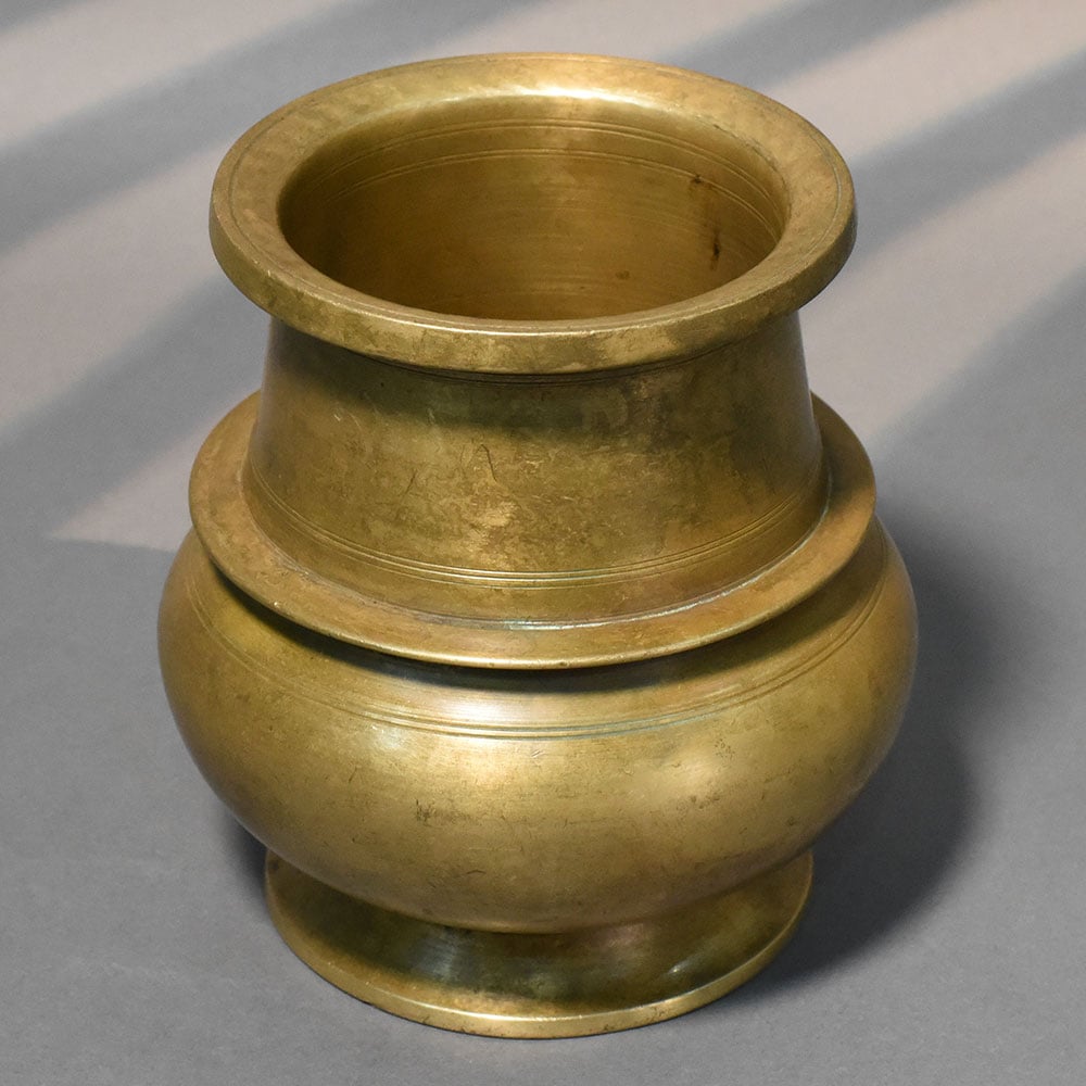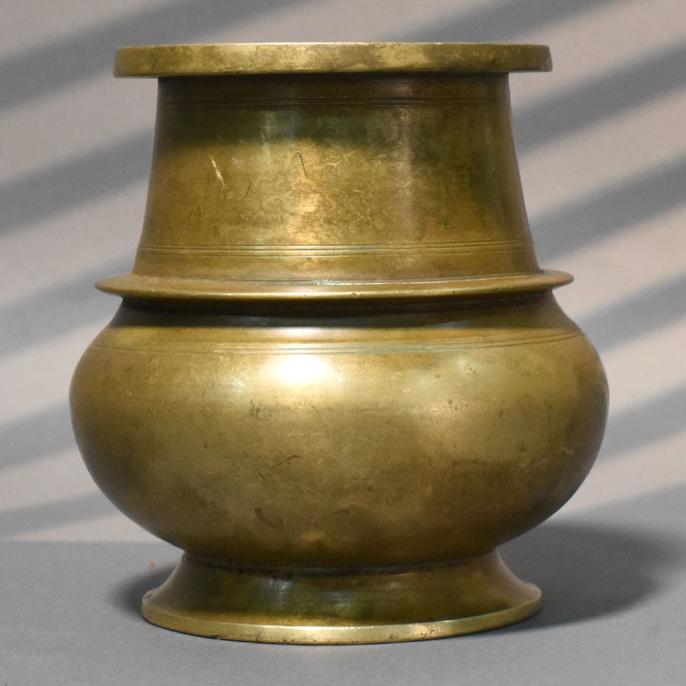 This handcrafted brass layered kalash traditional pooja vessel features a distinctive tiered silhouette that adds depth and character to a classic ritual form. The structured upper section combined with a rounded base creates a balanced profile, making it both functional and visually striking. Crafted from solid brass, the surface displays a naturally aged finish with subtle tonal variations and gentle marks that reflect its handcrafted origin. The layered neck design enhances grip and handling, while the wide rim allows easy filling and usage during rituals. Traditionally used in pooja ceremonies, water storage, and sacred offerings, this kalash holds deep cultural significance. Its stable base ensures secure placement on altars, while the expanded body provides adequate capacity for ritual use. The minimal yet architectural design makes it suitable not only for spiritual practices but also as a decorative accent in traditional and modern interiors. Its form stands out without excessive ornamentation, emphasizing craftsmanship and proportion. Ideal for daily rituals, festive use, gifting, or collectors of traditional brassware, this kalash combines durability, heritage, and functional elegance.