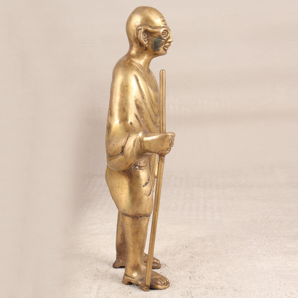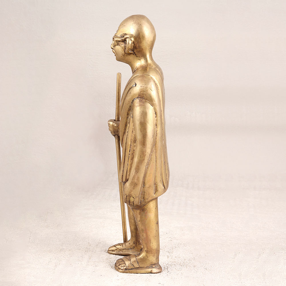 A Brass Mahatma Gandhi Statue which is a timeless tribute to the Father of the Nation. Meticulously handcrafted by skilled Indian artisans, this statue embodies the essence of Mahatma Gandhi's profound teachings and legacy. Standing gracefully with a serene expression, the statue captures the iconic leader's contemplative spirit. Crafted from high-quality brass, the statue boasts an antique brown finish, adding a touch of vintage charm to any space. Its intricate detailing reflects the dedication of our artisans, making it a work of art that transcends time. This versatile masterpiece is designed for various settings, making it a perfect addition to your home, office, restaurant, hotel, or cafe. Its presence not only enhances the aesthetic appeal of any space but also serves as a constant reminder of Gandhiji's principles of peace and non-violence. Whether you are a collector of vintage treasures or seeking a meaningful gift, this Brass Mahatma Gandhi Statue is a thoughtful choice. Celebrate special, festive, or auspicious occasions by gifting this symbol of wisdom, compassion, and resilience to your loved ones.