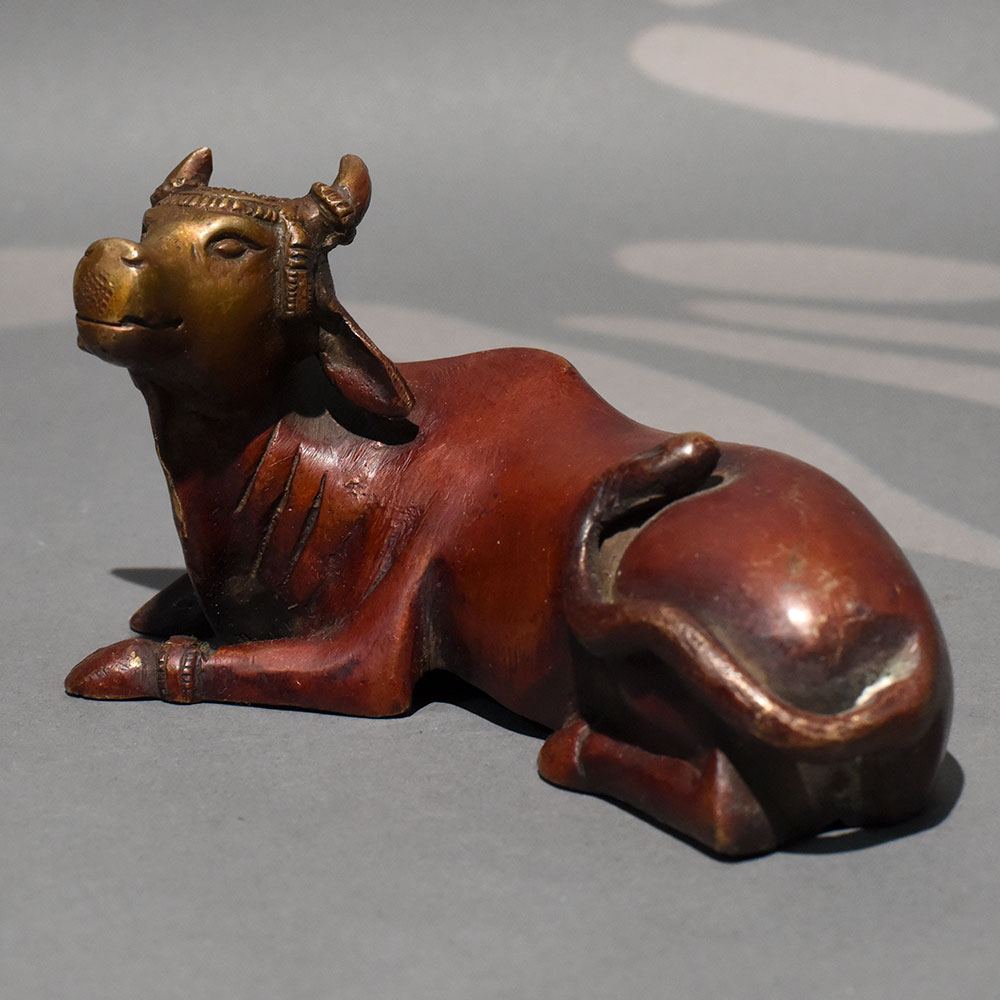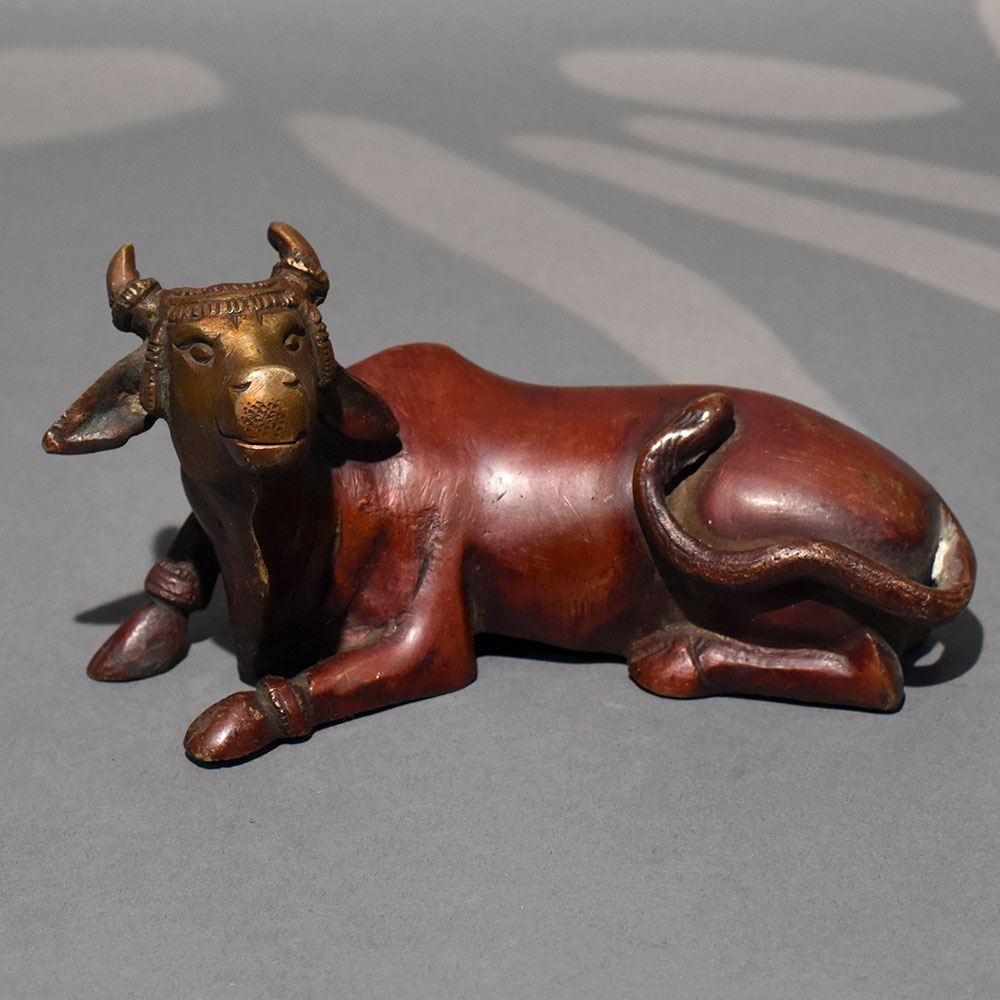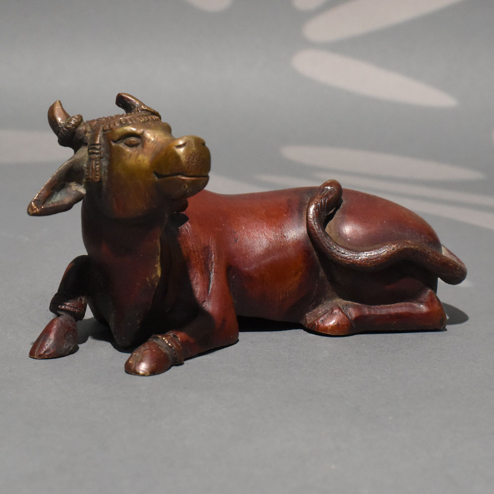 This handcrafted brass resting cow idol embodies serenity, grace, and traditional symbolism in a beautifully sculpted form. Designed in a relaxed reclining posture with gently folded legs and a curved tail, the figure reflects calmness and sacred presence. The smooth contours and detailed facial expression highlight the artisans skill in capturing lifelike features while maintaining a refined decorative aesthetic. Finished in a rich, earthy tone with subtle shading variations, the sculpture carries a warm antique character. The surface showcases soft polish accents that enhance the depth of its sculpted details, particularly around the face, horns, and body curves. Cast using traditional metalworking techniques, this handmade brass figurine reflects cultural artistry and enduring craftsmanship. The cow holds deep spiritual and cultural significance in many traditions, symbolizing prosperity, nurturing energy, and divine blessings. This decorative idol can be placed in pooja rooms, meditation spaces, living rooms, or curated heritage-inspired interiors. Its horizontal form makes it ideal for console tables, altar setups, or display cabinets where it can serve as a focal decorative element. The solid brass construction ensures durability while maintaining aesthetic elegance over time. Natural tonal variations further enhance its authenticity, making each piece subtly distinct.