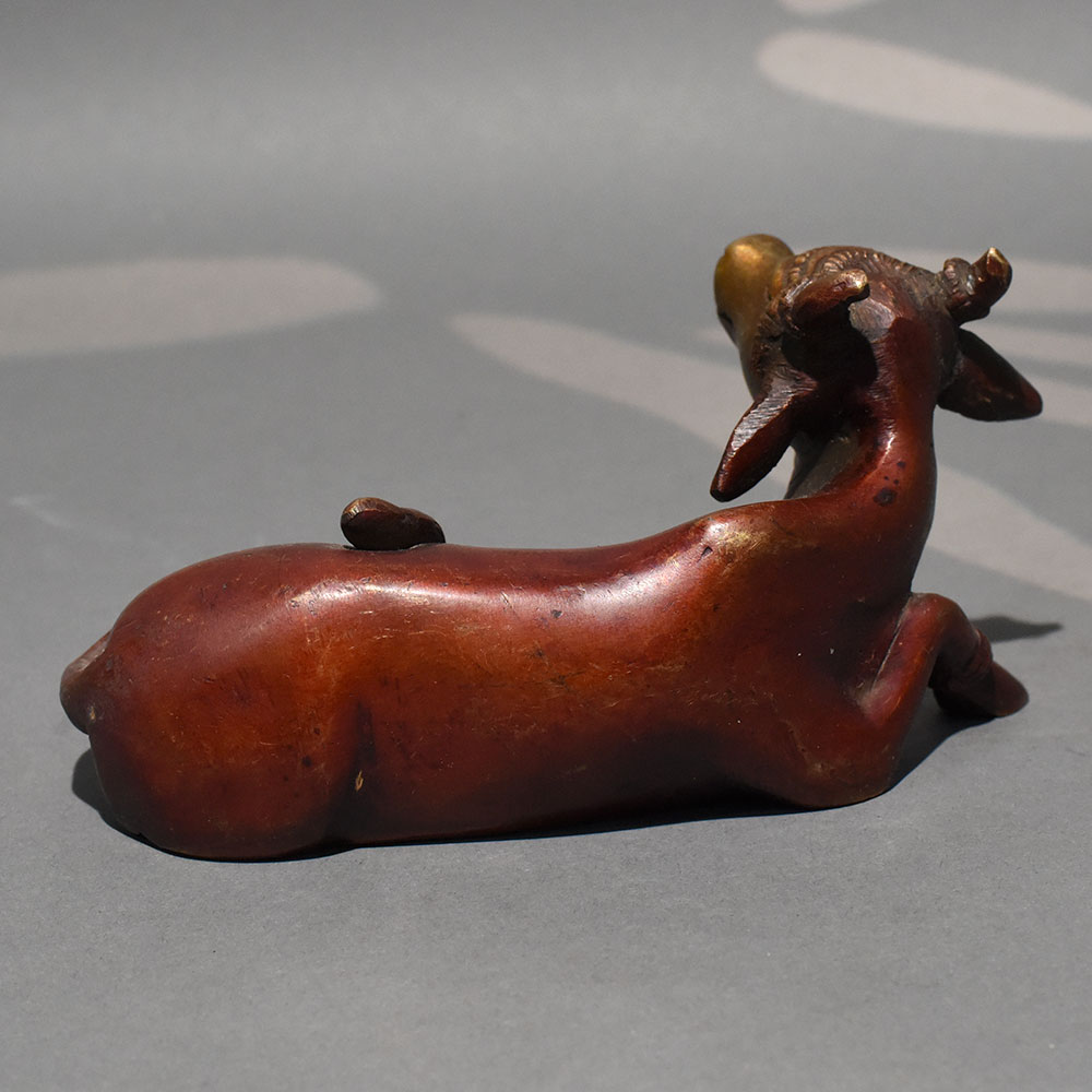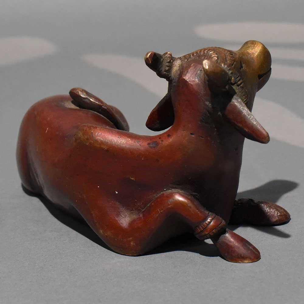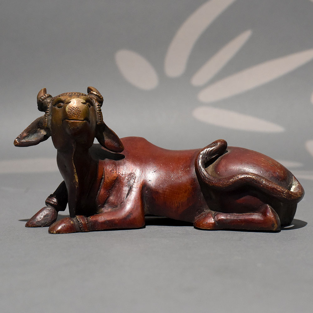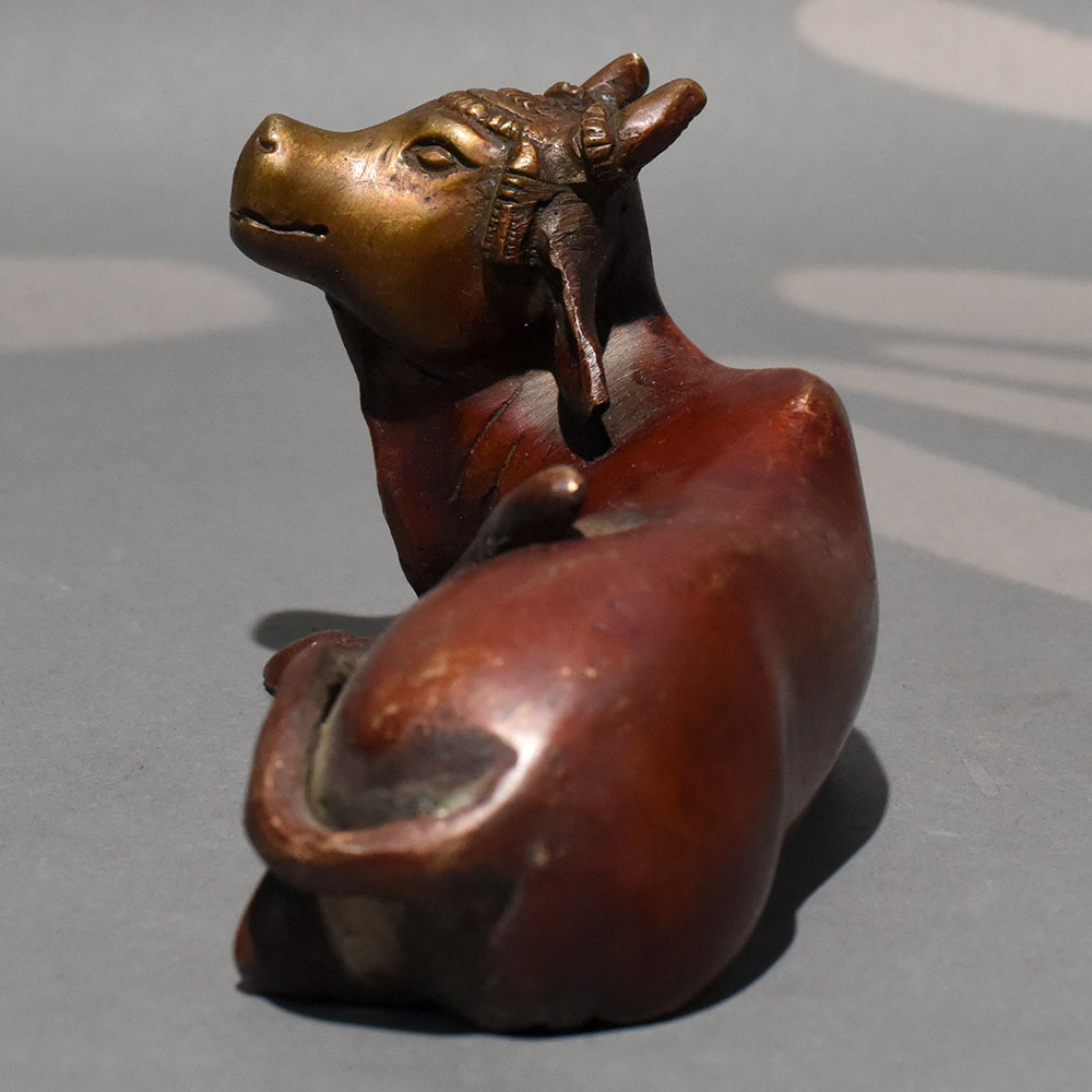 This handcrafted brass resting cow idol embodies serenity, grace, and traditional symbolism in a beautifully sculpted form. Designed in a relaxed reclining posture with gently folded legs and a curved tail, the figure reflects calmness and sacred presence. The smooth contours and detailed facial expression highlight the artisans skill in capturing lifelike features while maintaining a refined decorative aesthetic. Finished in a rich, earthy tone with subtle shading variations, the sculpture carries a warm antique character. The surface showcases soft polish accents that enhance the depth of its sculpted details, particularly around the face, horns, and body curves. Cast using traditional metalworking techniques, this handmade brass figurine reflects cultural artistry and enduring craftsmanship. The cow holds deep spiritual and cultural significance in many traditions, symbolizing prosperity, nurturing energy, and divine blessings. This decorative idol can be placed in pooja rooms, meditation spaces, living rooms, or curated heritage-inspired interiors. Its horizontal form makes it ideal for console tables, altar setups, or display cabinets where it can serve as a focal decorative element. The solid brass construction ensures durability while maintaining aesthetic elegance over time. Natural tonal variations further enhance its authenticity, making each piece subtly distinct.