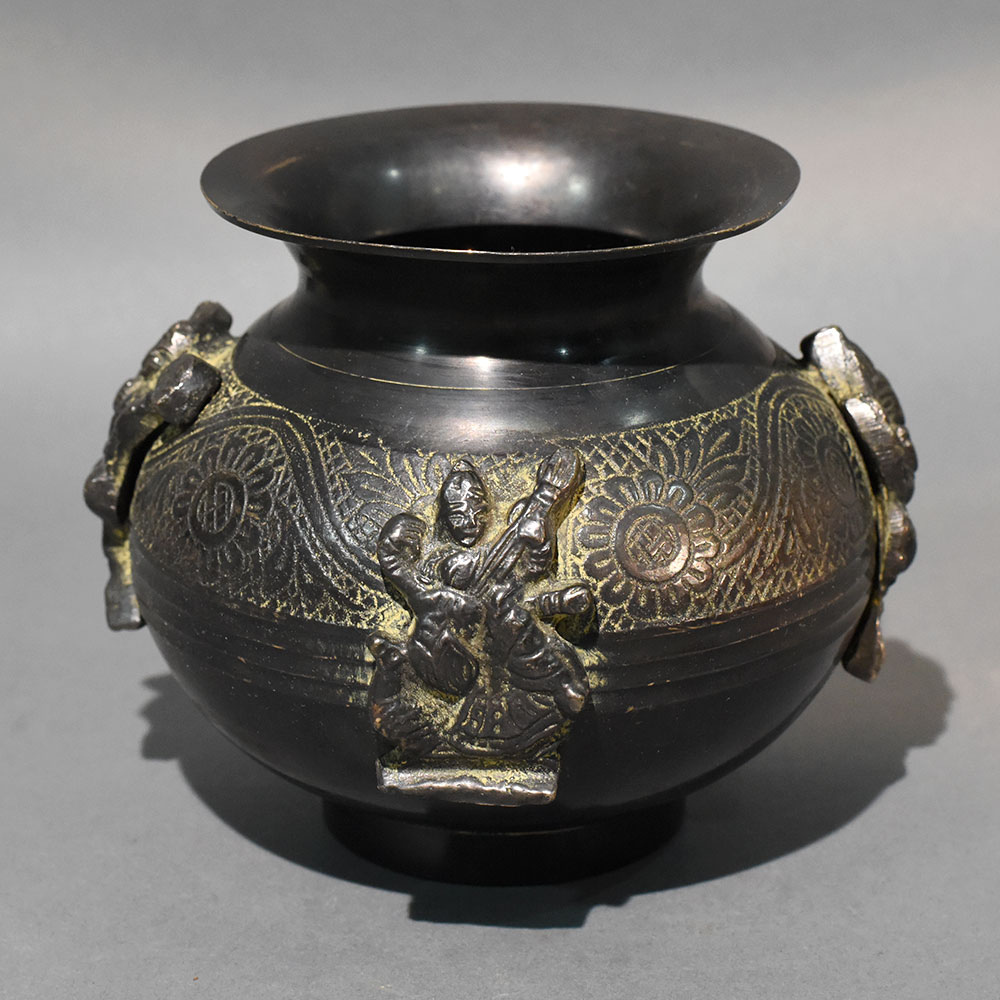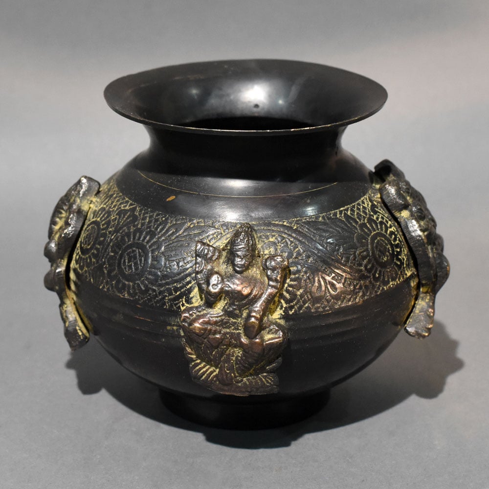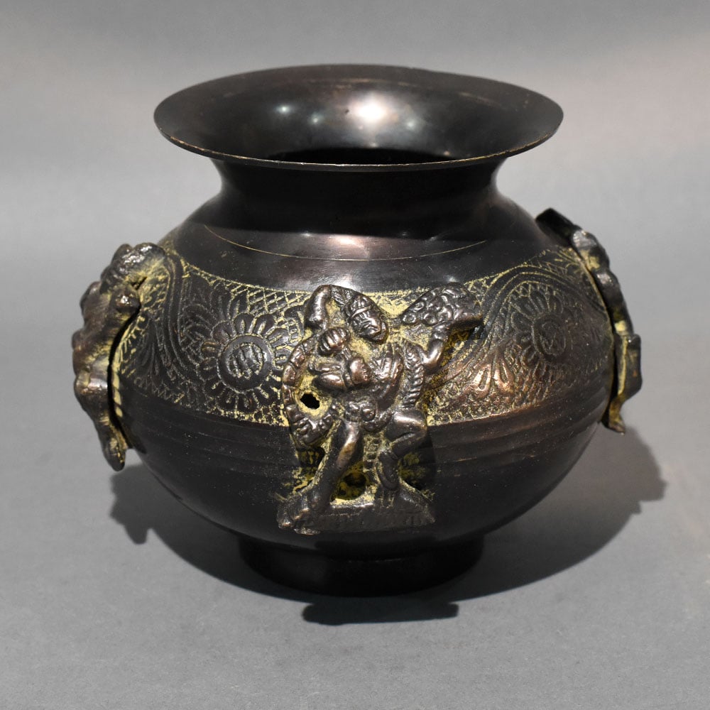 This handcrafted brass ritual pot features an ornate traditional form enhanced with sculpted female figure handles and engraved floral motifs. The rounded body displays intricate hand-etched patterns that radiate across the surface, forming symmetrical floral medallions and decorative textures that highlight traditional metal craftsmanship. Two sculptural female figure handles emerge from the sides of the vessel, adding symbolic character and artistic depth. These raised figures appear to hold the pot, giving the vessel a ceremonial presence often seen in temple vessels and ritual containers used in traditional Indian cultural settings. The wide flared mouth allows easy access and functional use, while the smooth upper rim contrasts beautifully with the richly textured lower body. The dark antique brass finish reveals natural golden highlights across the engraved patterns and sculpted figures, emphasizing the handcrafted detailing and aged aesthetic. Historically inspired brass vessels like this are often used in ritual practices, altar arrangements, or ceremonial decor. It can be used to hold sacred water, flowers, or offerings during pooja ceremonies, festive celebrations, and temple rituals. The sculptural form also makes it suitable as a decorative centerpiece in traditional interiors or heritage-inspired decor spaces. Crafted from solid brass using traditional metalworking techniques, the vessel offers durability and long-term preservation. Slight variations in finish and engraving reflect authentic handcrafted workmanship and contribute to the uniqueness of each piece.