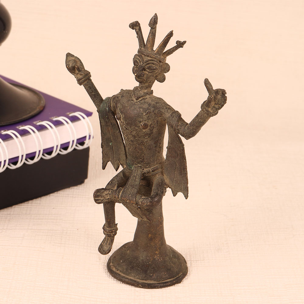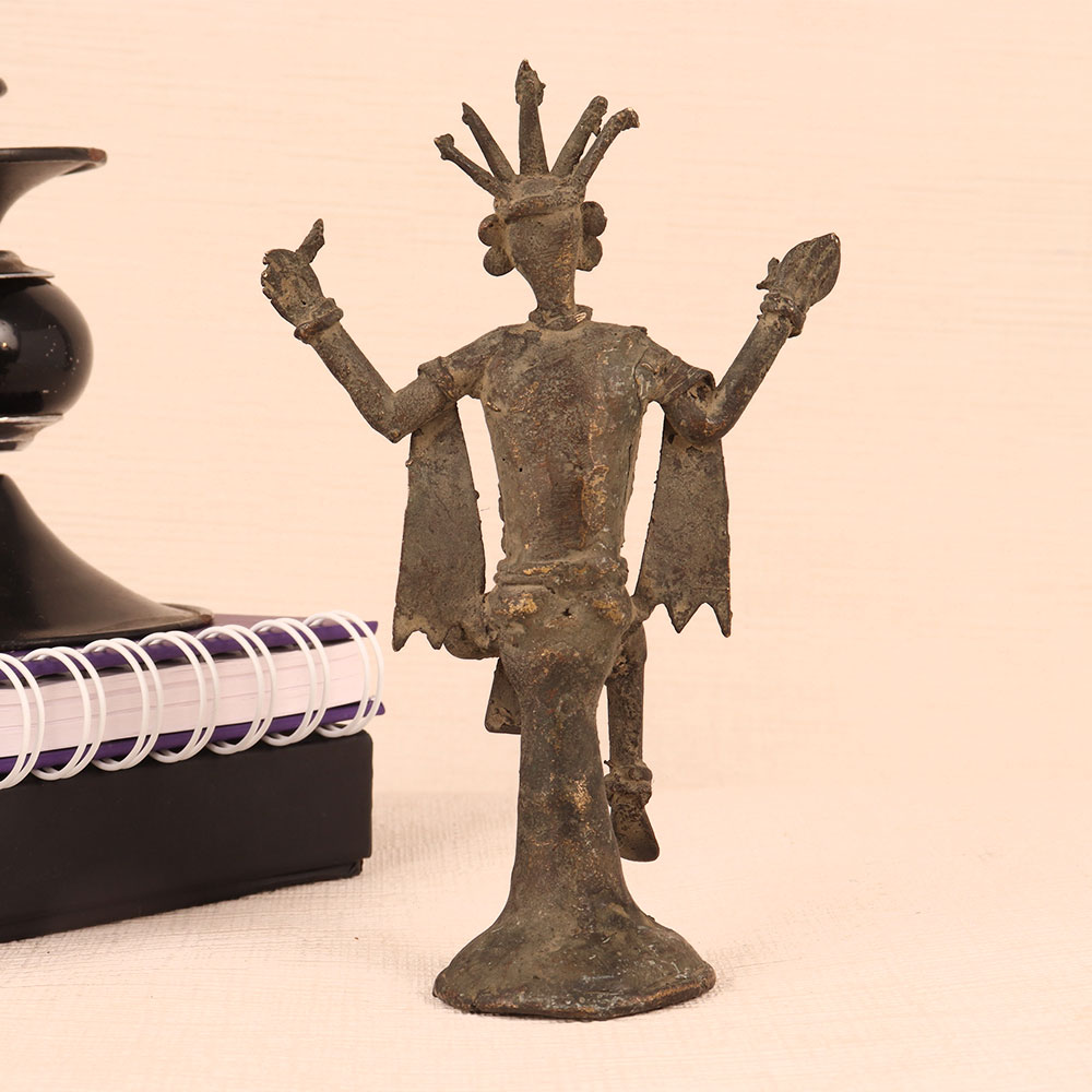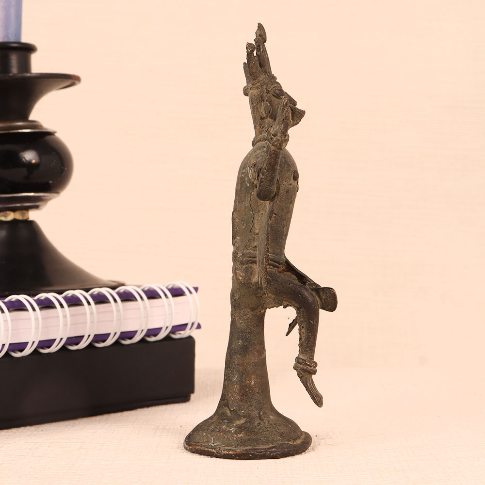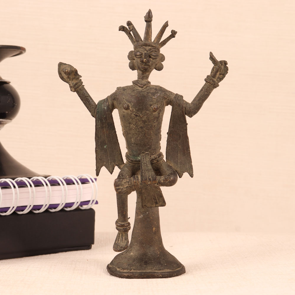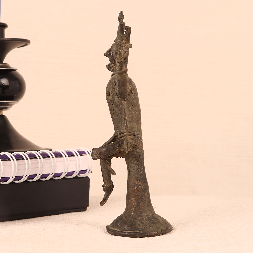 Enhance your home decor with the exquisite charm of our Folk Tribe Art Brass Statue of God. Crafted with meticulous precision by talented Indian artisans, this masterpiece showcases the rich heritage of Indian craftsmanship. Sitting regally on a vintage brown-finished platform, the deity is adorned with a magnificent crown, adding a touch of royal elegance to any setting. The statue cast from high-quality brass exudes a timeless appeal and a warm, vintage aura. This versatile piece can find a cherished place in your home, office, restaurant, hotel, cafe, or shop's prayer room. Its aura of divine serenity makes it ideal for personal devotion or as a stunning decorative item. Collectors of vintage treasures will find it a valuable addition to their ensemble. Whether it's a special occasion, a festive celebration, or an auspicious moment, this brass deity statue makes for a thoughtful and meaningful gift. Share the blessings and the beauty of Indian craftsmanship with your loved ones.