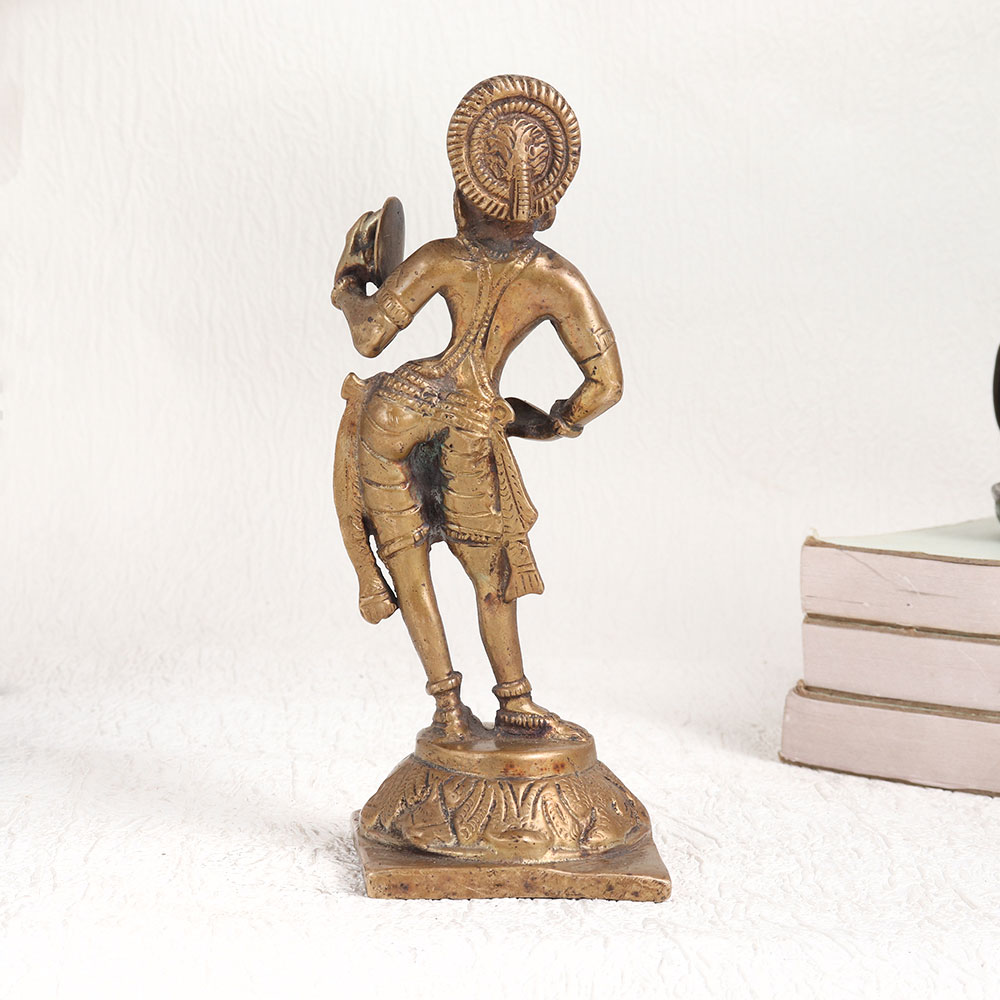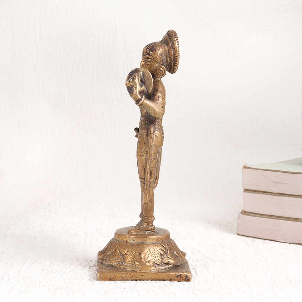 Adorn your decor with the timeless elegance of this exquisite brass statue of standing lady. Crafted by highly skilled Indian artisans, this stunning piece captures the essence of sophistication and artistry. Standing on a platform, a graceful lady gazes into a handheld mirror, her poise and beauty frozen in time. The antique brown finish lends an air of vintage charm, making it a perfect addition to any setting - be it your home, office, restaurant, hotel, cafe, or shop. Its versatile design seamlessly blends with various decor styles, adding a touch of class to any space. This handmade masterpiece is created using high-quality brass, ensuring its durability and exquisite detailing. Whether you're an avid collector or looking for a unique accent piece, this statue is a must-have. Showcase it at exhibitions or simply use it to adorn your living space. Moreover, it makes for a thoughtful gift for your loved ones on special, festive, or auspicious occasions, symbolizing beauty, artistry, and the rich heritage of Indian craftsmanship.