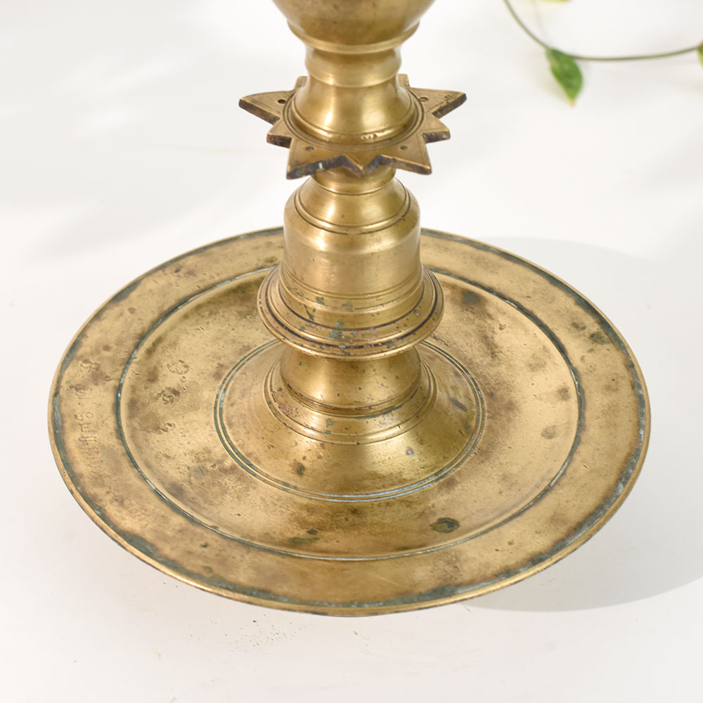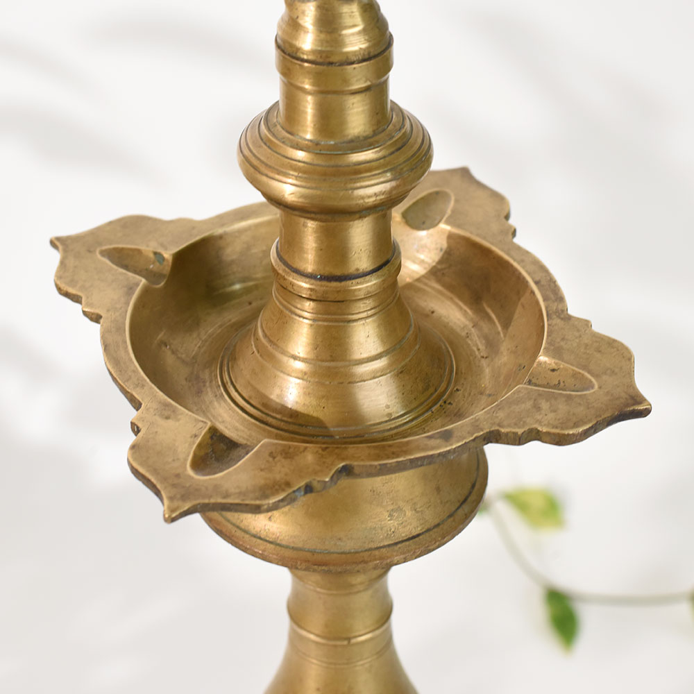 Embrace the timeless elegance of South Indian craftsmanship with this vintage brass oil lamp stand, designed in a traditional temple-inspired silhouette. Featuring a beautifully carved finial, a wide diya plate, and a gracefully contoured column, this lamp stand showcases the artistry and cultural depth of heritage metalwork. The piece is crafted from solid brass, giving it a rich antique patina that enhances its authentic old-world charm. Its wide circular base ensures stability, making it ideal for ceremonial lighting, festivals, pooja rituals, meditation spaces, or heritage home decor. Whether displayed as a spiritual accent or used during devotional practices, this lamp stand radiates purity, divinity, and cultural beauty.