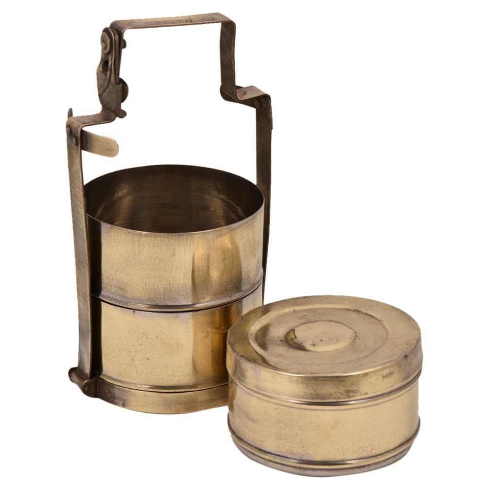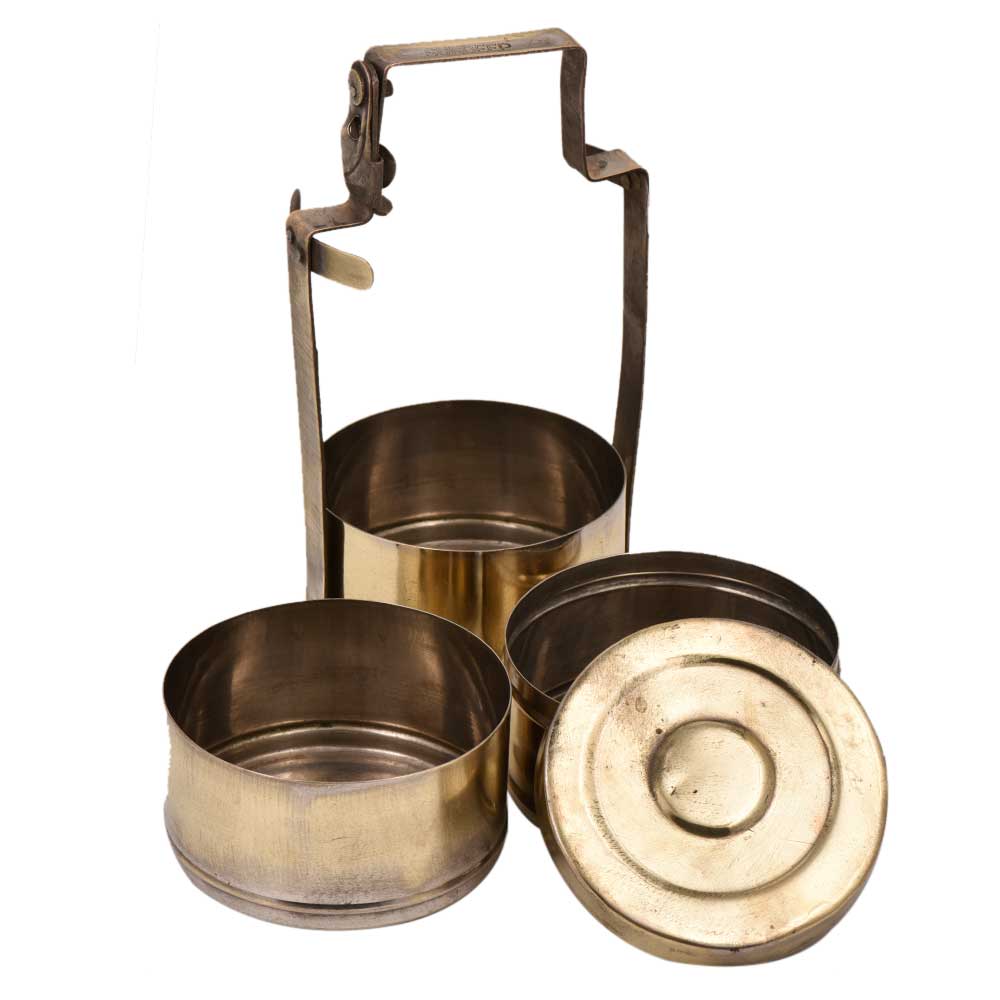This is an old brass lunch box with three containers. The brass lunch boxes were very popular and are now used as table ornaments, jewelry storage or presentation of food .The boxes were are engraved with the names of the owner so that it could not be misplaced.