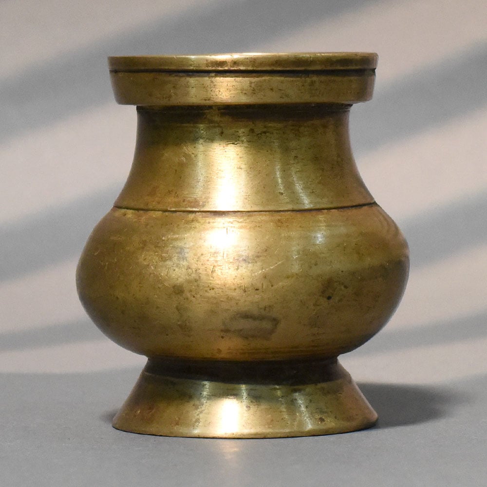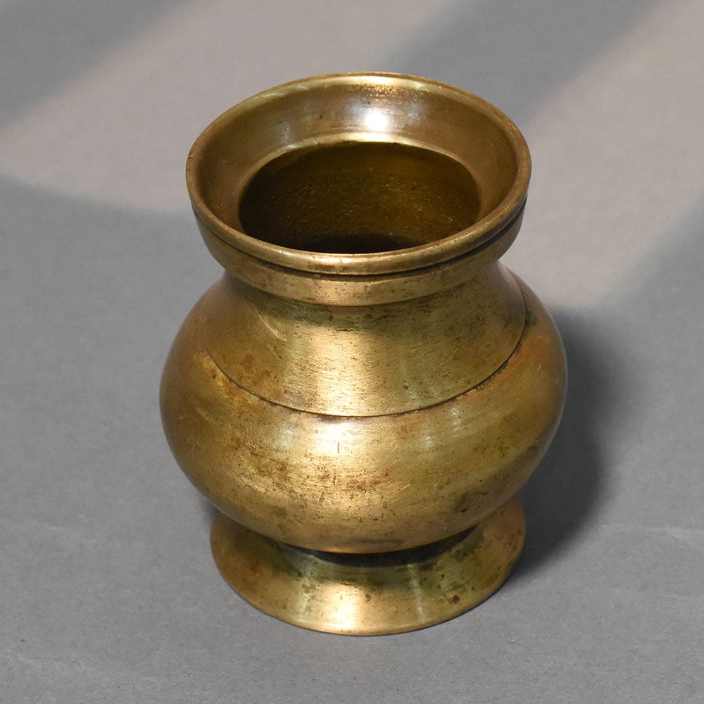 This handcrafted brass traditional round pot ritual vessel is a classic representation of Indian cultural utility objects, designed with simplicity, balance, and purpose. Featuring a rounded belly, short neck, and sturdy circular base, this vessel reflects the timeless forms used in daily rituals and traditional practices. The compact design allows for easy handling while maintaining a stable structure. Its smooth curves and proportionate silhouette create a harmonious visual appeal, making it both functional and aesthetically pleasing. The wide mouth ensures convenient filling and pouring, making it suitable for holding water, oil, or other ritual elements. Crafted from solid brass, the surface showcases natural textures and subtle tonal variations that come from hand-finishing processes. These details highlight its artisanal origin and ensure that no two pieces are exactly alike. Over time, the brass develops a richer patina, enhancing its vintage charm and authenticity. Traditionally used in pooja rituals, temple offerings, and spiritual ceremonies, this vessel also works beautifully as a decorative accent in heritage-inspired interiors. Whether placed on an altar or displayed as part of a curated collection, it brings warmth and cultural depth to any space. Ideal for those who value handcrafted objects with historical significance, this brass pot is a meaningful addition to both functional and decorative settings.