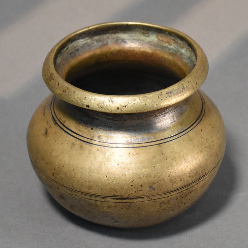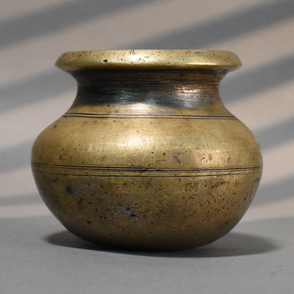This handcrafted brass vintage finish sacred ritual kalash pot is a refined expression of traditional Indian craftsmanship, designed with a classic rounded form and a broad, slightly flared rim. Its balanced proportions and smooth curvature reflect timeless utility combined with aesthetic simplicity. The surface carries a naturally aged brass patina, featuring subtle darkened tones around the neck and delicate speckled textures across the body. Fine horizontal etched lines enhance its visual depth while maintaining a minimal, elegant design language. These organic imperfections highlight the authenticity of the handcrafted process, ensuring that each piece is truly one of a kind. Crafted from solid brass, this kalash is both durable and functional. The wide opening allows for easy use during rituals, making it ideal for holding water, flowers, or sacred offerings. Its sturdy base ensures stability, making it suitable for daily spiritual practices as well as ceremonial occasions. Traditionally used in pooja rituals, vastu practices, and festive ceremonies, this brass pot also works beautifully as a decor element. Its earthy tones and heritage-inspired design complement both traditional settings and modern interiors, adding warmth and cultural depth to any space. Perfect for collectors, spiritual practitioners, or those who appreciate handcrafted heritage objects, this piece blends simplicity, function, and timeless appeal.