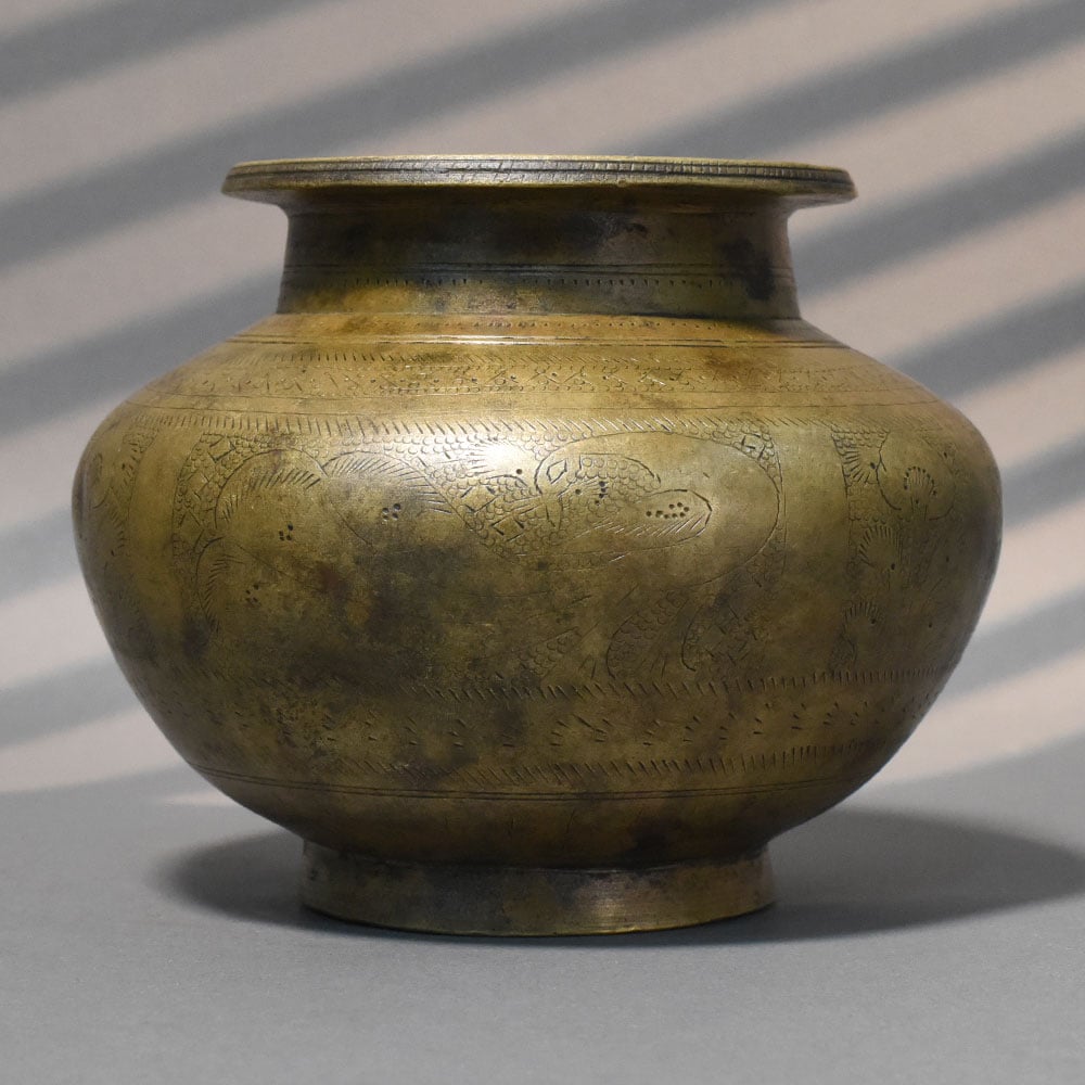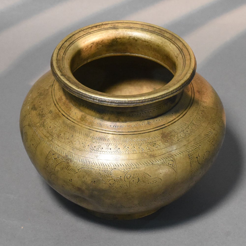 This handcrafted brass wide mouth engraved kalash vessel combines functional design with fine surface detailing. The broad, open neck allows easy access for filling and cleaning, while the rounded body provides a traditional silhouette rooted in Indian ritual use. Crafted from solid brass, the surface features delicate engraved patterns that wrap around the vessel, adding texture and visual interest. The naturally aged finish enhances the detailing, giving the kalash an authentic, heritage-inspired appearance. Traditionally used in pooja ceremonies, sacred water storage, and ritual offerings, this kalash holds strong cultural significance. The wide opening makes it especially practical for daily use, while the stable base ensures secure placement on altars or temple spaces. The engraved design also makes it suitable as a decorative brass accent, blending effortlessly into traditional interiors or adding warmth to modern spaces. Its form balances simplicity with craftsmanship, making it both usable and display-worthy. Ideal for spiritual practices, gifting, or collectors of traditional brassware, this kalash offers durability, functionality, and timeless appeal.