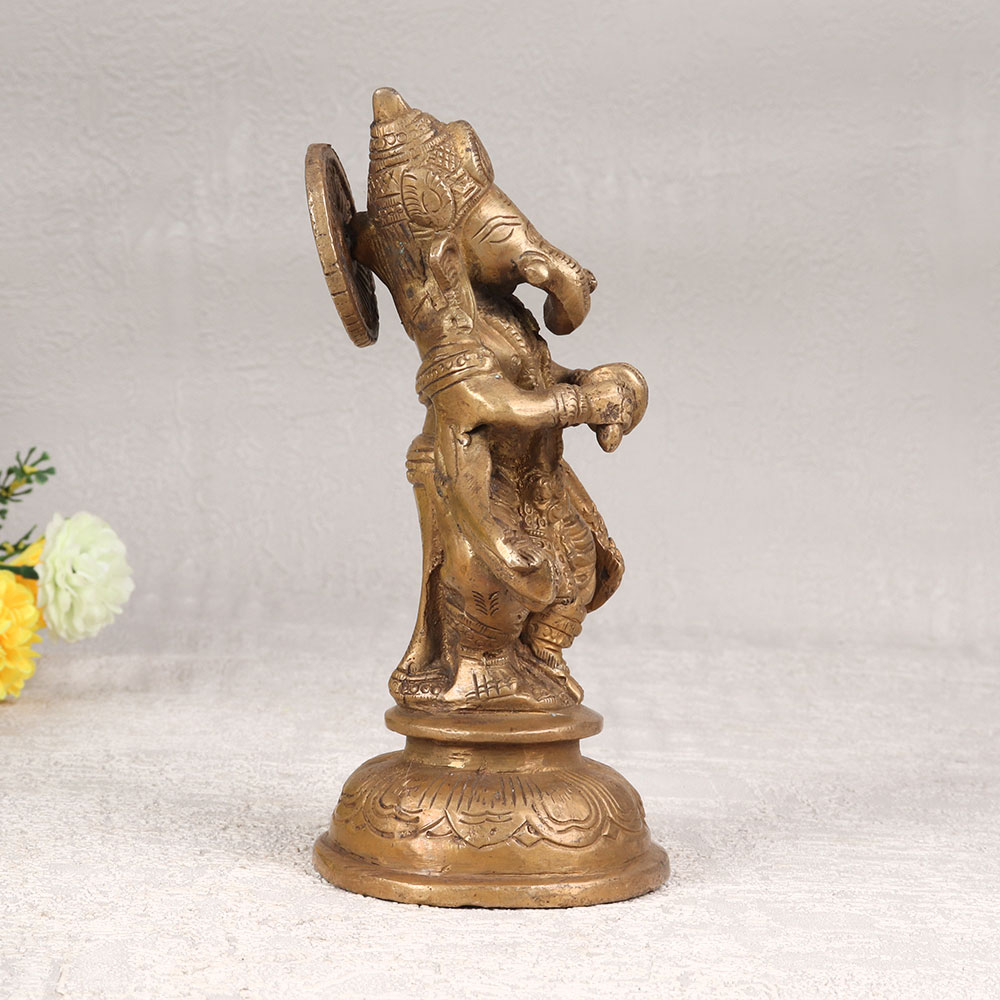 Enhance your prayer room with the divine presence of this exquisite Brass Lord Ganesha statue that is a testament to Indian craftsmanship and spirituality. Meticulously handcrafted by highly skilled artisans in India, this stunning piece features Lord Ganesha, the remover of obstacles, standing in a commanding pose while playing the cymbals. The statue boasts a rich antique brown finish, adding a touch of vintage elegance to any environment. Crafted from high-quality brass, the intricate details and fine craftsmanship showcase the dedication of the artisans who poured their skill and passion into creating this masterpiece. Versatile in its placement, this statue is a harmonious addition to your home, office, restaurant, hotel, or cafe prayer room, creating an atmosphere of tranquillity and positivity. This exceptional work of art isn't just a decorative piece, it's a symbol of blessings and auspiciousness. Embrace the cultural richness and spiritual significance of Lord Ganesha, and consider adding this statue to your vintage collection. Moreover, it makes for a thoughtful and meaningful gift for your loved ones on special, festive, or auspicious occasions.
