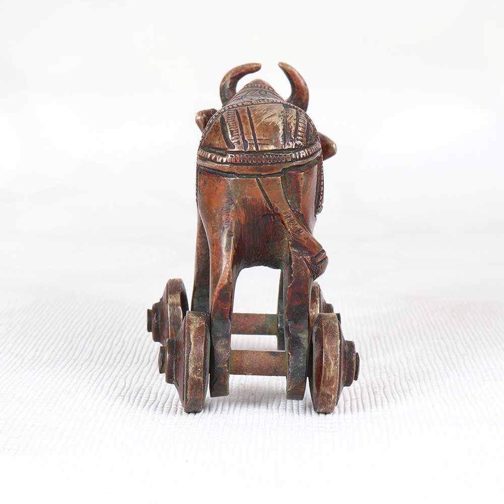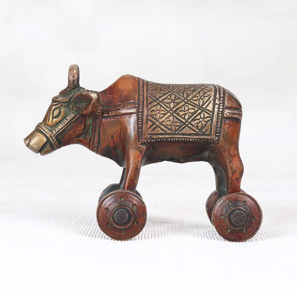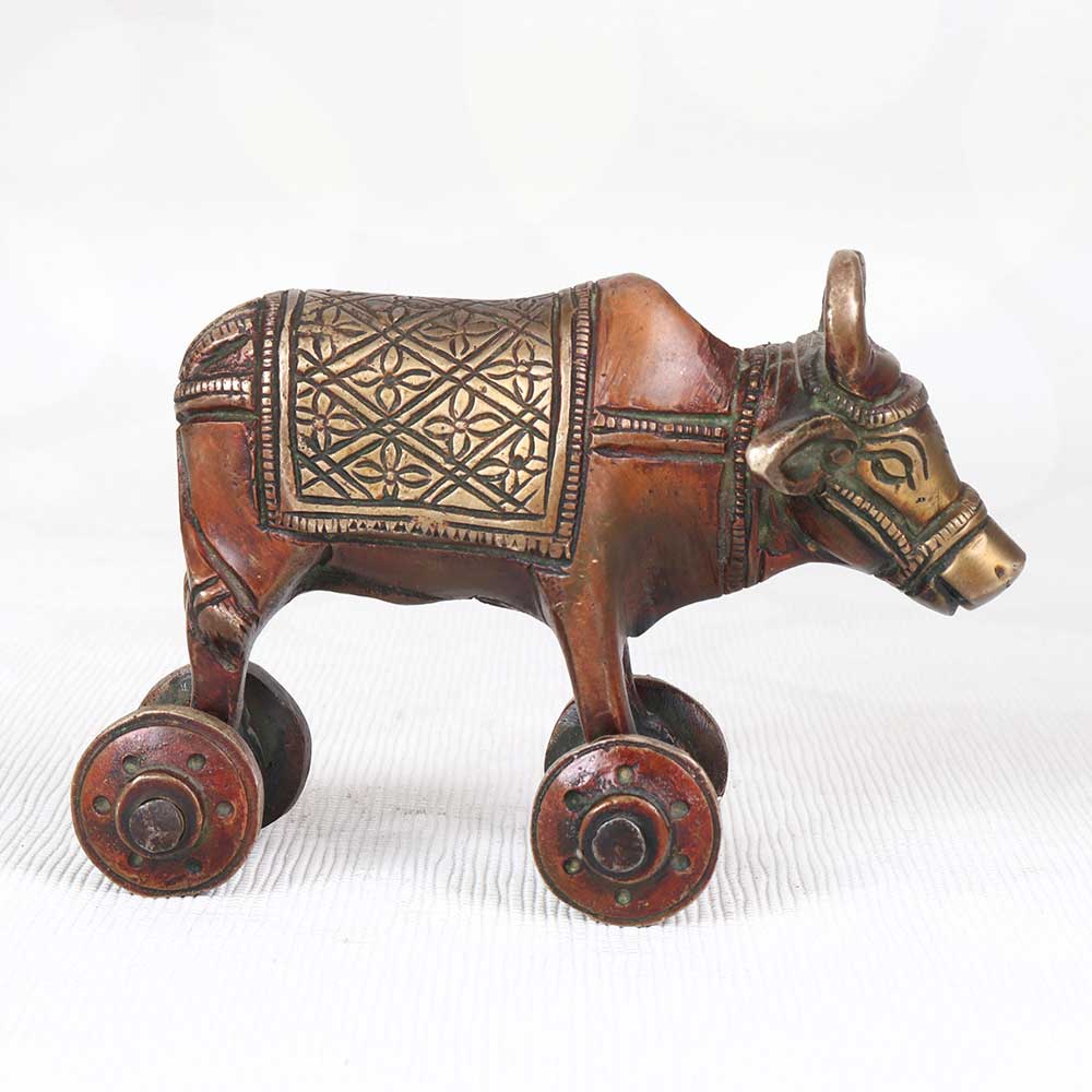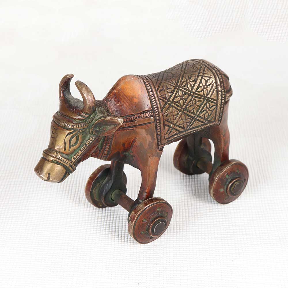 Step into the past with this exquisite vintage brass bull from Central India. Crafted with meticulous detail, this four-wheeled bull exudes the elegance of a bygone era. Let this vintage brass bull transport you back in time. Lovingly designed and cast using methods passed down through generations of skilled artisans, this bull captures the rich heritage of India's metal craftsmanship. Display this in your home to add a touch of history and whimsy. The fine details and expert craftsmanship of this brass bull make it a truly special decorative piece. Give your home decor a one-of-a-kind focal point that your guests will admire. Perfect for collectors and anyone who appreciates the beauty of vintage artifacts. This brass bull on wheels will delight as a distinctive home accent.