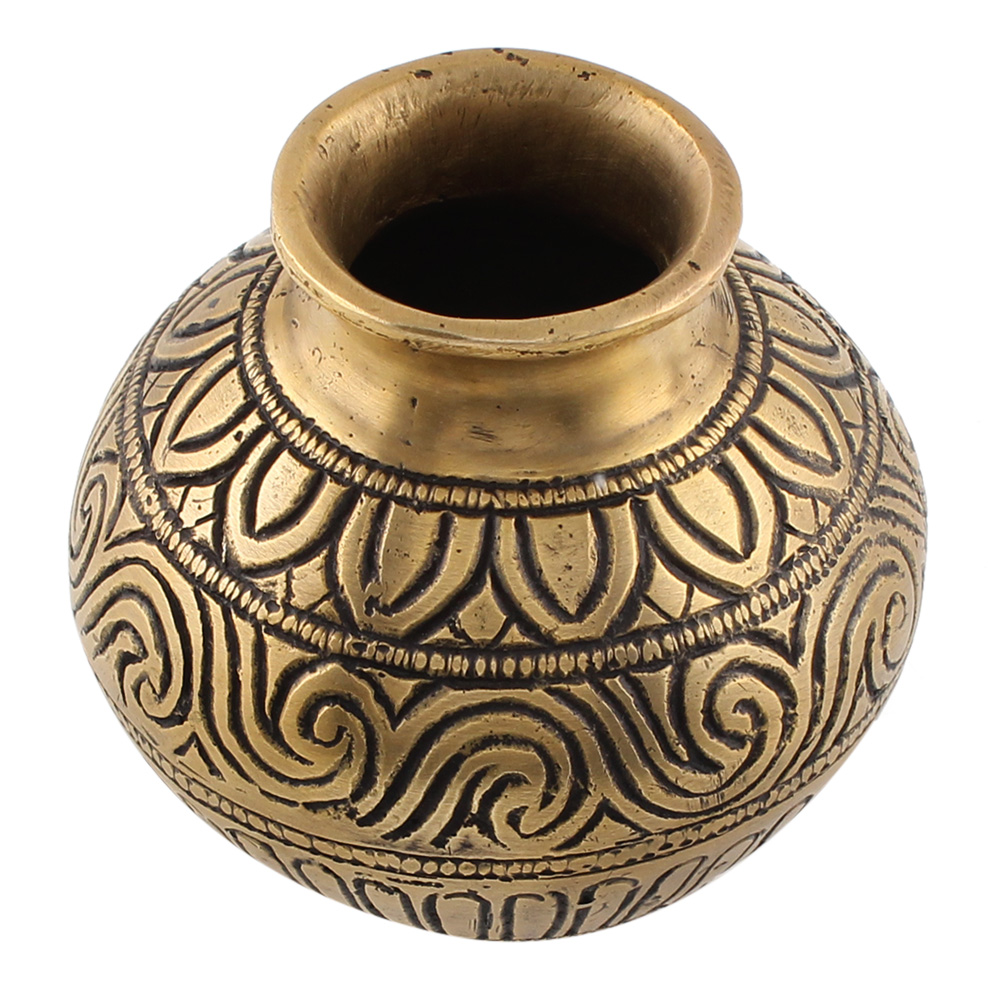 This finely carved brass pot is ideal for keeping in the temple. This kalash can be used for pooja, house décor, weddings, and other occasions. Perfect gift for  Diwali, weddings, rakhi, anniversaries, festivals, poojas, and birthdays.