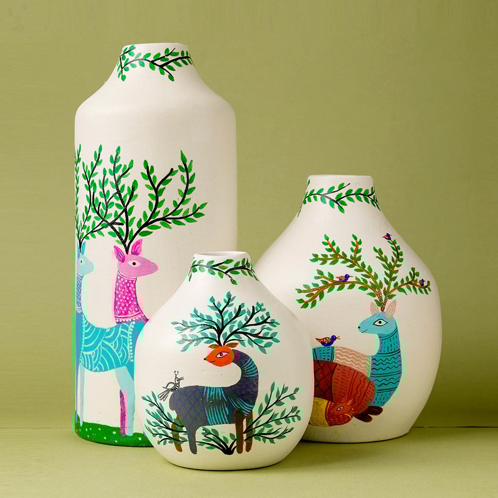 This artistic ceramic vase set features Gond art inspired deer family motifs carefully hand painted by artisans. The nature themed composition of animals and foliage reflects the storytelling tradition of tribal Indian art. Designed for decorators, collectors, and thoughtful gift buyers, this handcrafted vase set introduces cultural elegance to interiors. Packed and quality checked by Indianshelf.