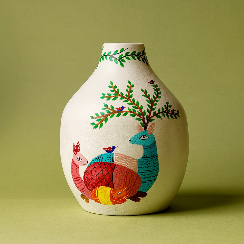 This ceramic decorative vase features Gond art inspired resting deer and bird motifs carefully hand painted by artisans. The peaceful animal composition and branching tree design reflect the storytelling traditions of tribal Indian painting that celebrate harmony in nature. Designed for decorators collectors and thoughtful gift buyers this handcrafted vase brings artistic character to interior spaces. Packed and quality checked by Indianshelf.