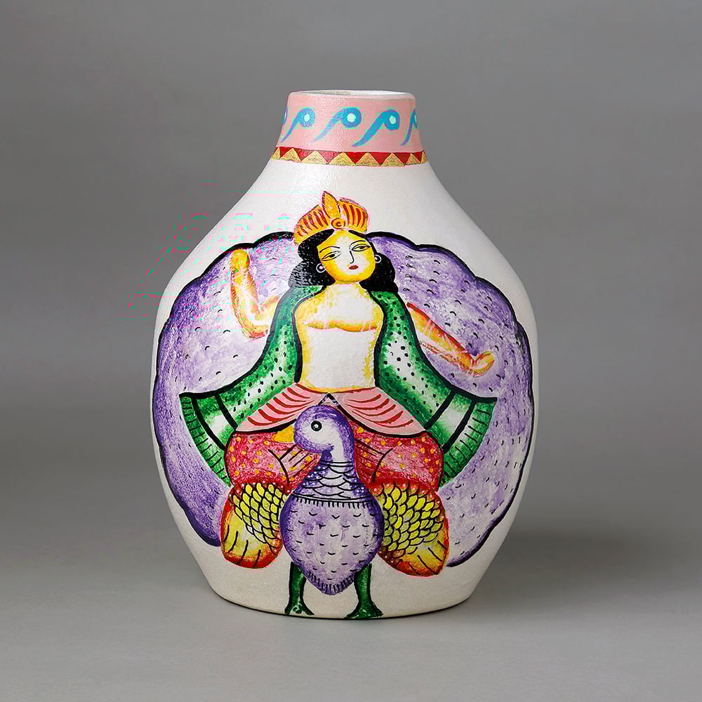 This decorative vase highlights the beauty of Kalighat folk painting through the striking depiction of Kartikeya seated on his symbolic peacock. The bold outlines expressive posture and vivid colors represent the narrative tradition of Indian temple and devotional art.