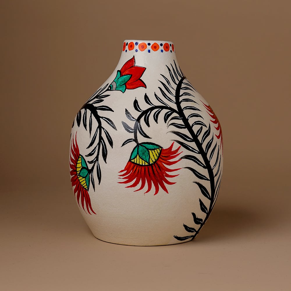 This decorative vase highlights the elegance of Madhubani painting through expressive vine patterns and stylized floral elements. The intricate lines and vibrant colors create a visually striking design that celebrates the natural themes often found in traditional Indian folk art.