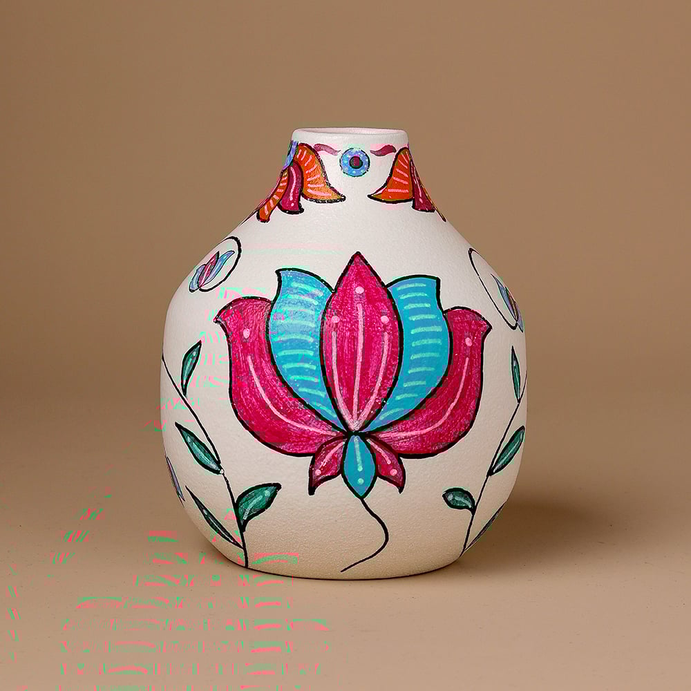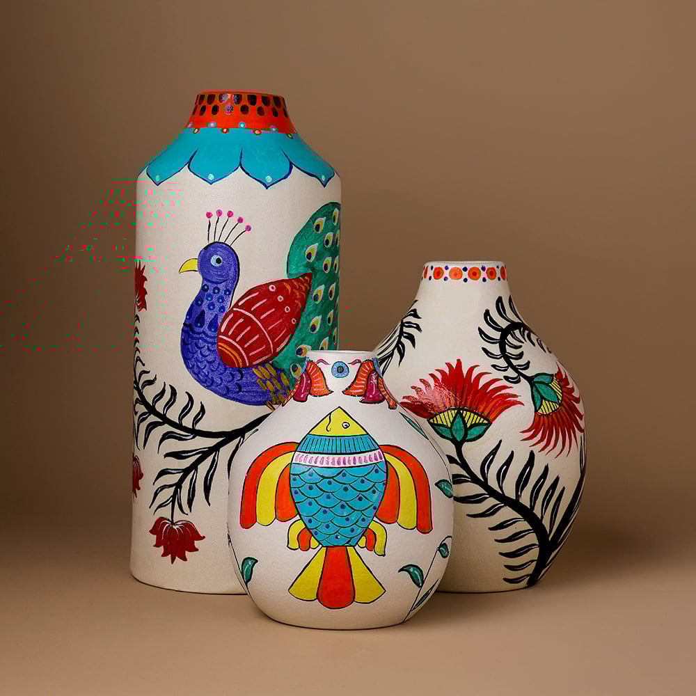 This decorative vase set celebrates the timeless Madhubani painting tradition through vivid colors, detailed bird motifs, and flowing botanical elements. Each piece reflects artistic precision and cultural storytelling, making the set visually captivating for those who appreciate handcrafted decor.