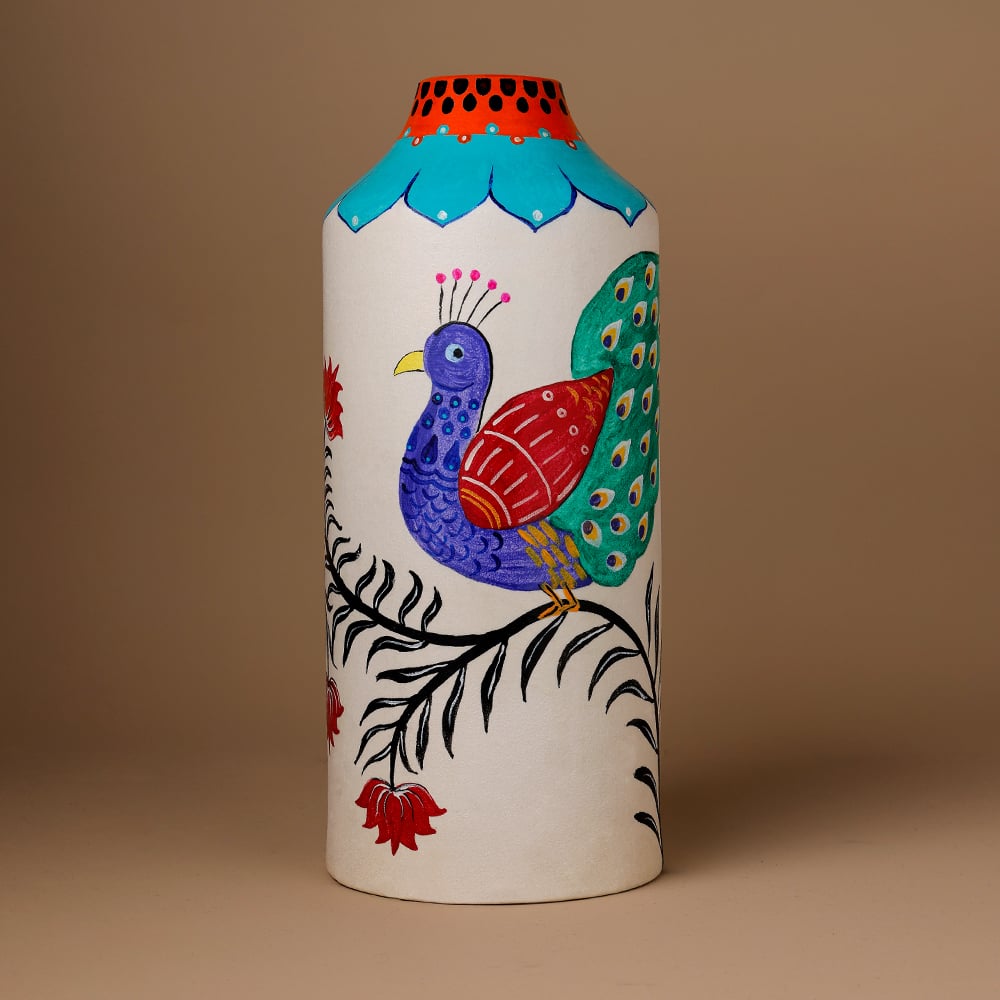 This decorative vase highlights the expressive beauty of Madhubani painting through a vividly hand painted peacock motif and ornamental foliage. The detailed lines and bold colors create a striking visual presence that celebrates traditional Indian artistic heritage.