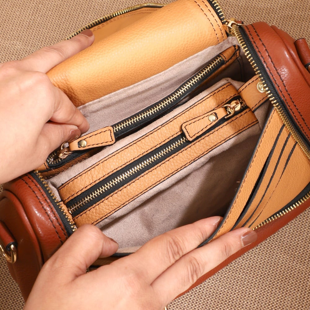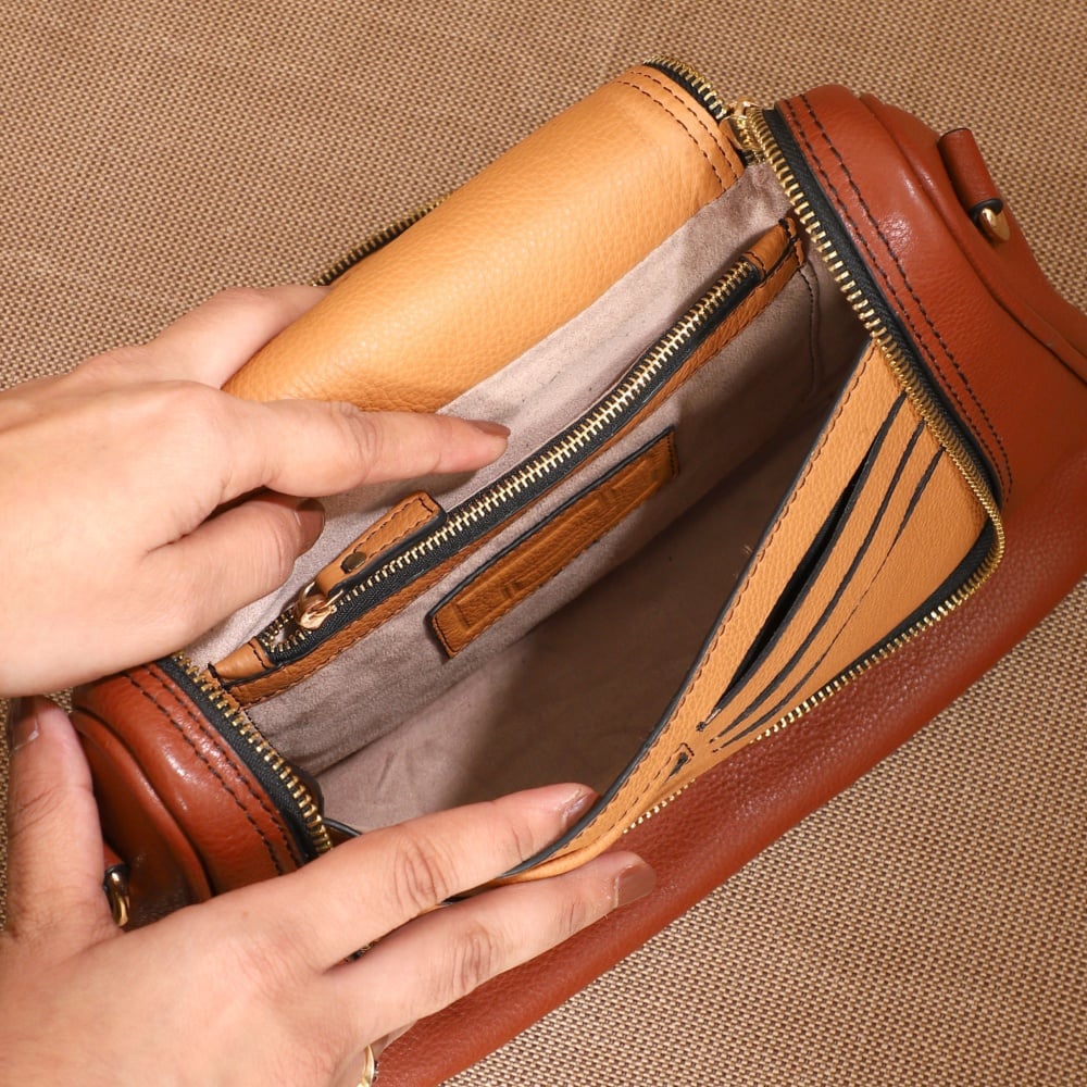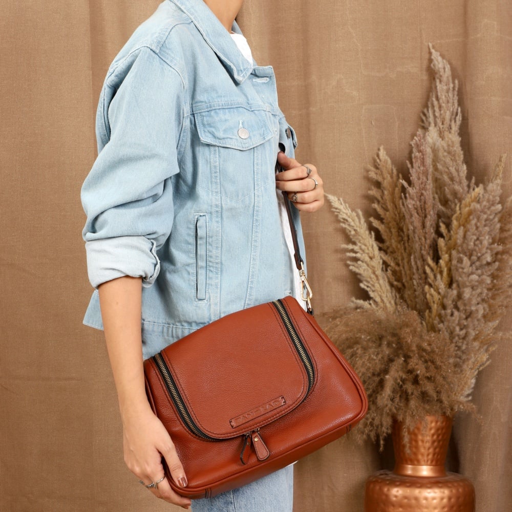 Crafted from gorgeous Sienna and Peach leather it has a sleek, modern design, featuring a 2-way zipper closure for easy access to your belongings. The adjustable and detachable crossbody sling allows you to wear it comfortably, whether you prefer it over the shoulder or across the body. Under the flap, the front panel houses a set-in welt mobile pocket, perfect for storing your phone, along with 3 card slots for quick and easy access to your essentials.