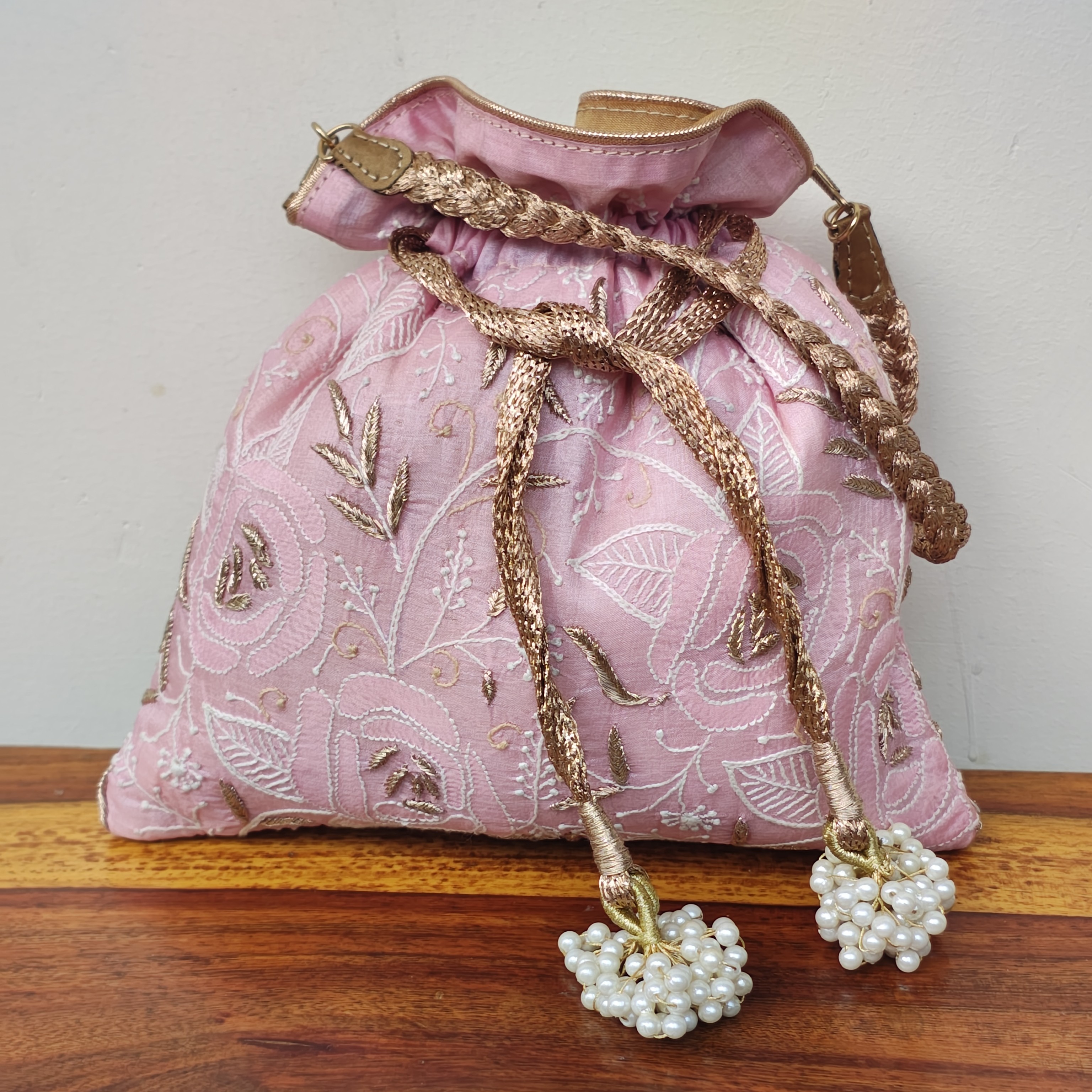 Add a soft and graceful charm to your festive ensemble with this beautifully handcrafted potli bag, made from rich tussar silk in a delicate pastel pink shade. Featuring intricate Chikankari embroidery on both sides, this piece is elevated with elegant gold kasab thread highlights, creating a sophisticated and traditional appeal. The floral motifs are delicately crafted, reflecting timeless artistry with a modern edge. Designed for both elegance and functionality, this potli features a golden braided handle and a drawstring closure, adorned with clustered pearl tassels at each end—adding a touch of luxe flair. Lightweight and spacious enough for your essentials, it’s perfect for weddings, festivals, or special events. Whether paired with sarees, salwar suits, or Indo-western outfits, this potli complements a wide range of looks. A must-have accessory for those who appreciate refined detailing and effortless style rooted in tradition.