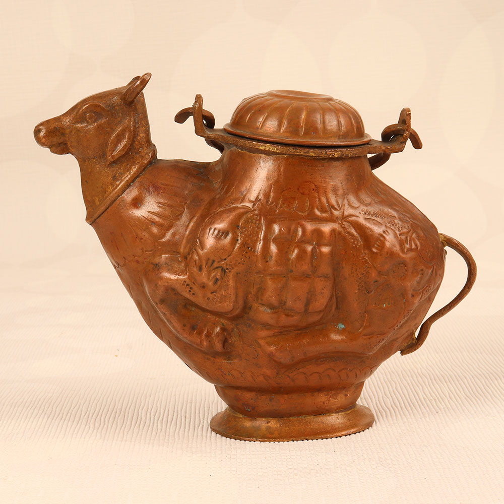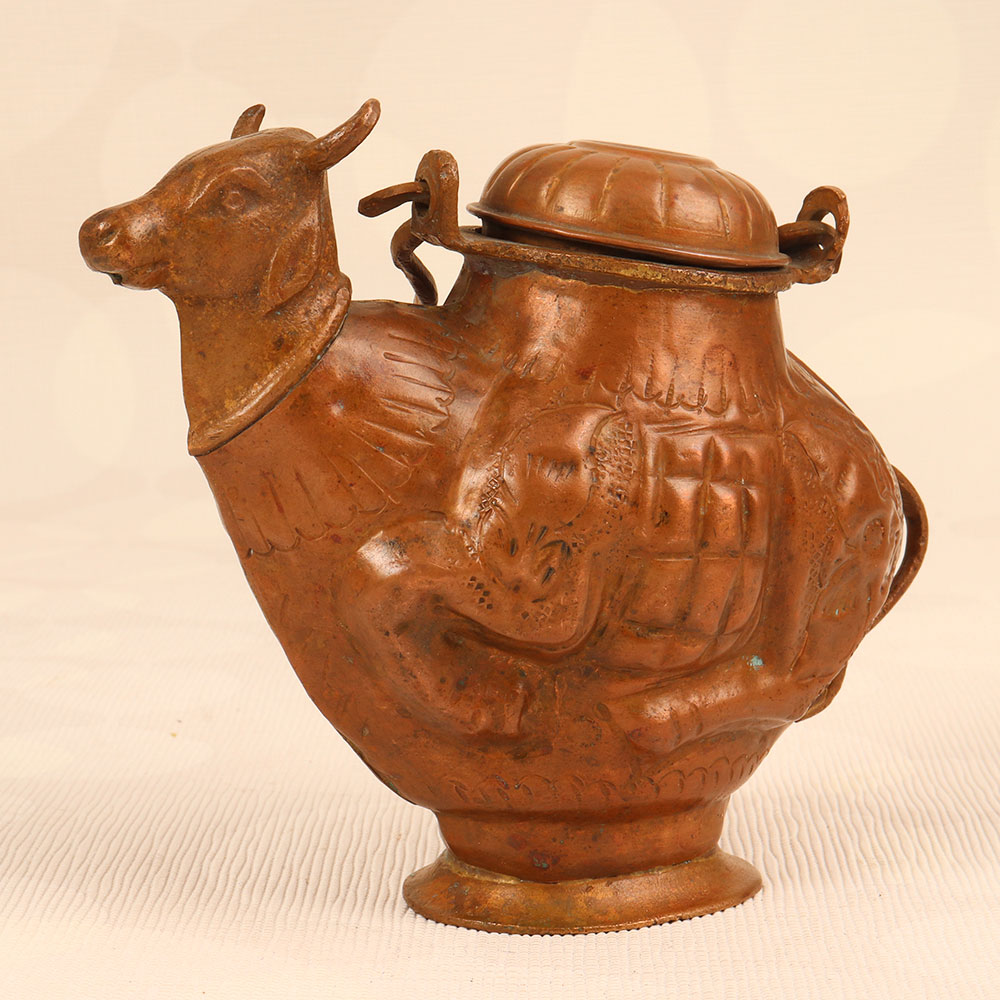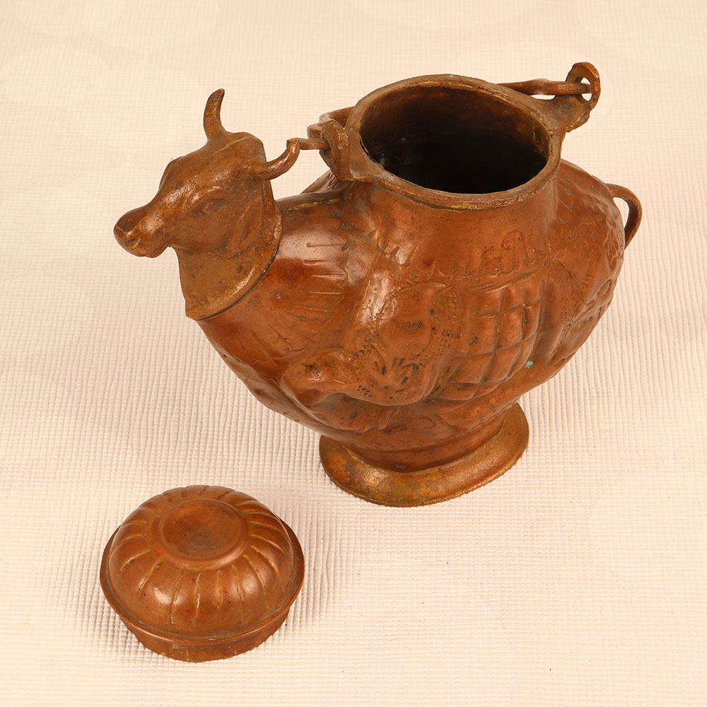 Buy a Copper Holy Water Pot online that is a unique blend of tradition and artistry that adds a touch of spiritual elegance to any space. This sacred vessel is crafted in the shape of a revered cow, symbolizing purity and divinity in Hindu culture. Handmade by talented Indian artisans, each pot is meticulously shaped from high-quality copper, ensuring durability and authenticity. The antique brown finish enhances its aesthetic appeal, giving it a timeless charm that complements both modern and traditional interiors. The pot features a secure lid and a sturdy handle, allowing for easy handling and ensuring the sacred water within is preserved in its sanctity. This versatile piece is not only a symbol of religious reverence but also a statement of artistic excellence. Perfect for adorning homes, offices, restaurants, hotels, or cafes, it seamlessly merges functionality with cultural significance. It serves as an ideal gift for your loved ones on special, festive, or auspicious occasions, symbolizing blessings, good fortune, and the richness of tradition.