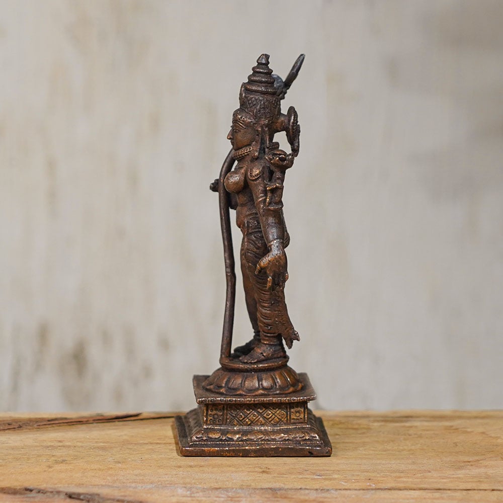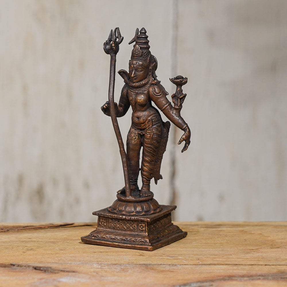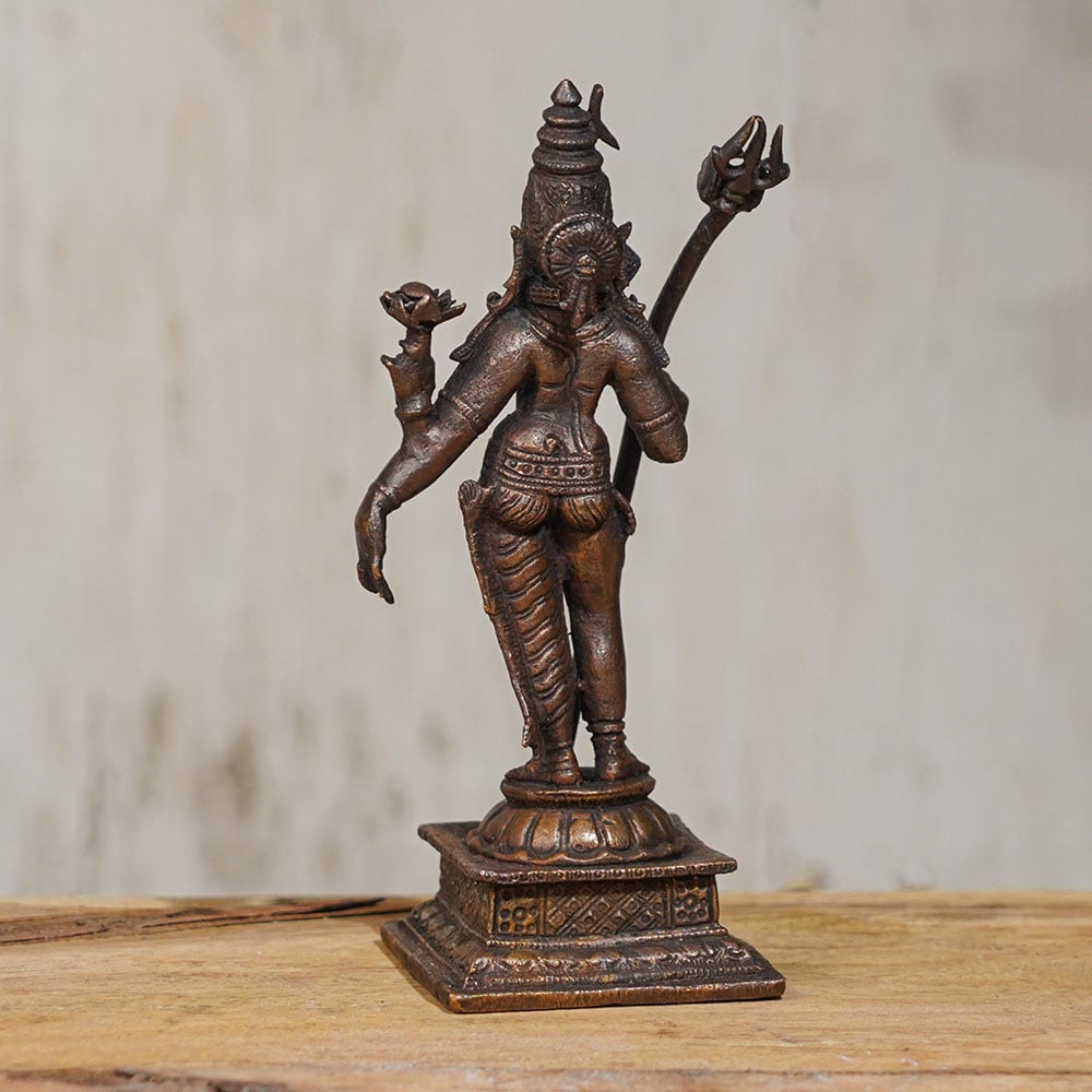 The Hindu God Lord Shiva is known as the destroyer of evil and is one of the most revered deities in Hinduism. This handmade copper statue of Lord Shiva is a magnificent representation of his powerful form, made by skilled Indian artisans who have honed their craft over generations. The statue depicts Lord Shiva standing with his weapon, the Trishul, held in his right hand. The intricate details on the statue are a testament to the skill of the artisans, who have brought Lord Shiva to life with their craftsmanship. The statue is a perfect addition to any prayer room at home or office, and can also be used in temples for worship. If you're looking to buy a Lord Shiva statue online, this handmade copper statue is the perfect choice. It is an auspicious gift for special and festive occasions, and is sure to be cherished by your loved ones for years to come. Bring home this Lord Shiva Copper statue for home decoration today and feel the presence of the divine in your space.