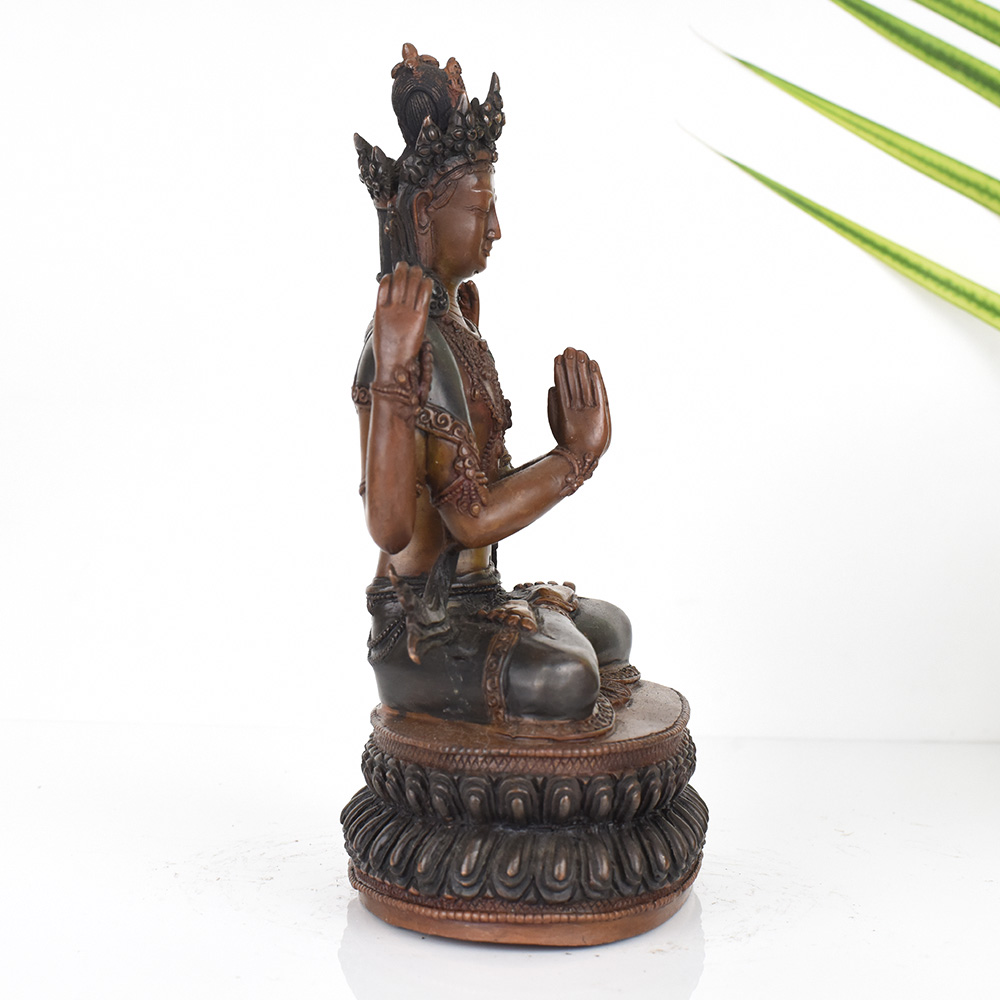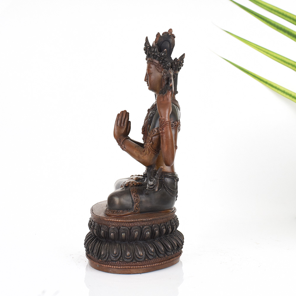 Chenrezig, also known as Avalokiteshvara, is revered across the Buddhist world as the embodiment of infinite compassion. This vintage copper statue, crafted with time-honored Tibetan techniques, invites you to cultivate that same boundless kindness within your own heart. As you gaze upon Chenrezig's serene expression, you'll feel your worries melt away, replaced by a profound sense of inner peace and clarity. Whether you're an experienced practitioner or just beginning your spiritual journey, this stunning statue can serve as a powerful focal point for your meditation and devotional practices. Place it in your prayer room or meditation space, and let its calming presence guide you towards greater self-awareness, empathy, and enlightenment. Invest in this timeless treasure, and unlock the transformative wisdom of one of Buddhism's most beloved deities.