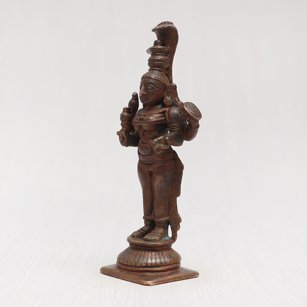 Embrace the divine presence with the exquisite Hindu Goddess Maa Mariamman Copper Statue, a masterpiece crafted by highly talented Indian artisans. Standing gracefully on a platform, this statue radiates spiritual energy, meticulously handmade from high-quality copper with a vintage-style finish. Perfect for your prayer room at home, office, restaurant, cafe, or shop, its eye-catching detailing adds a touch of elegance and charm to any space. This captivating copper statue serves as an ideal showpiece for exhibitions, decorations, and collections, showcasing the finest artistry. Celebrate special occasions by gifting this divine creation to your loved ones, making it an auspicious and unforgettable present. Step into the realm of divine beauty and culture as you explore the finest Hindu god statues to buy on our website.