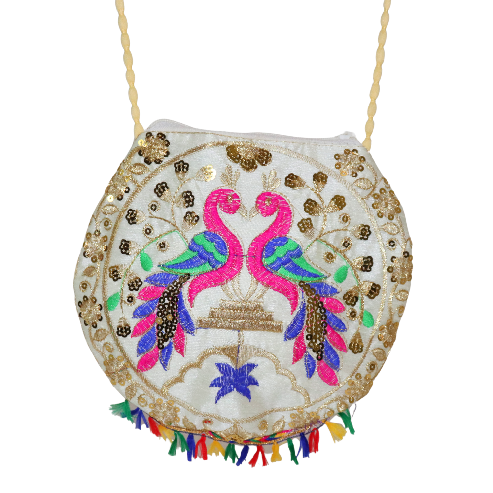 Add a unique touch to your wardrobe with this beautiful handmade cotton handbag, adorned with intricate beadwork and vibrant embroidery. Featuring colorful parrot designs and golden floral accents, this bag is perfect for both casual and festive occasions. The soft cotton fabric ensures comfort and durability, while the delicate beaded chain adds an elegant touch. Vibrant tassels at the bottom give the bag a playful flair, making it a standout accessory. Ideal for carrying your essentials in style, this hand-stitched handbag combines traditional craftsmanship with a modern flair. Whether for a day out or a special event, it is sure to complement any outfit. Embrace the charm of handmade artistry with this one-of-a-kind piece! Perfect for gifting or adding to your personal collection, this handbag is a versatile and functional accessory.