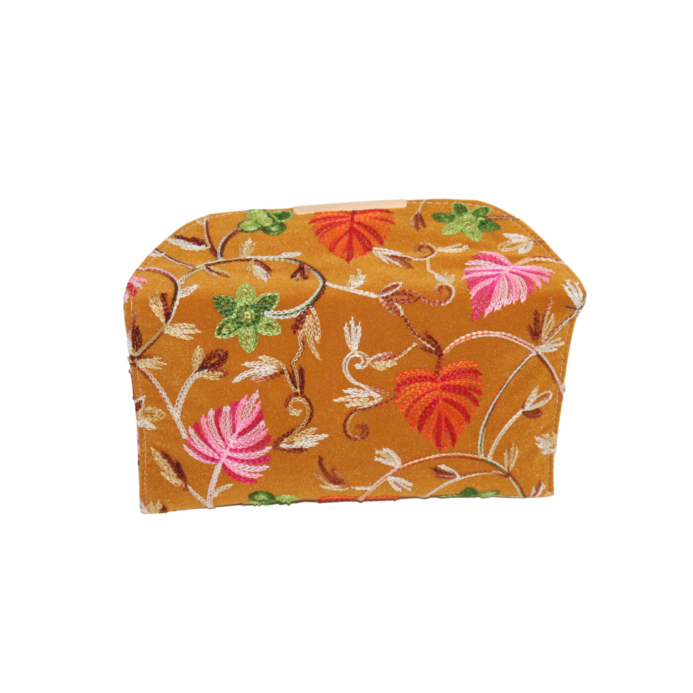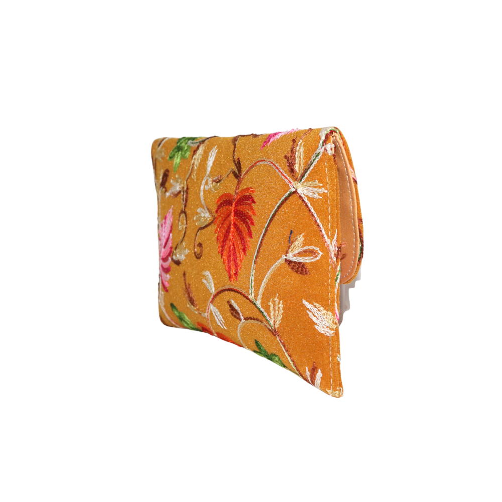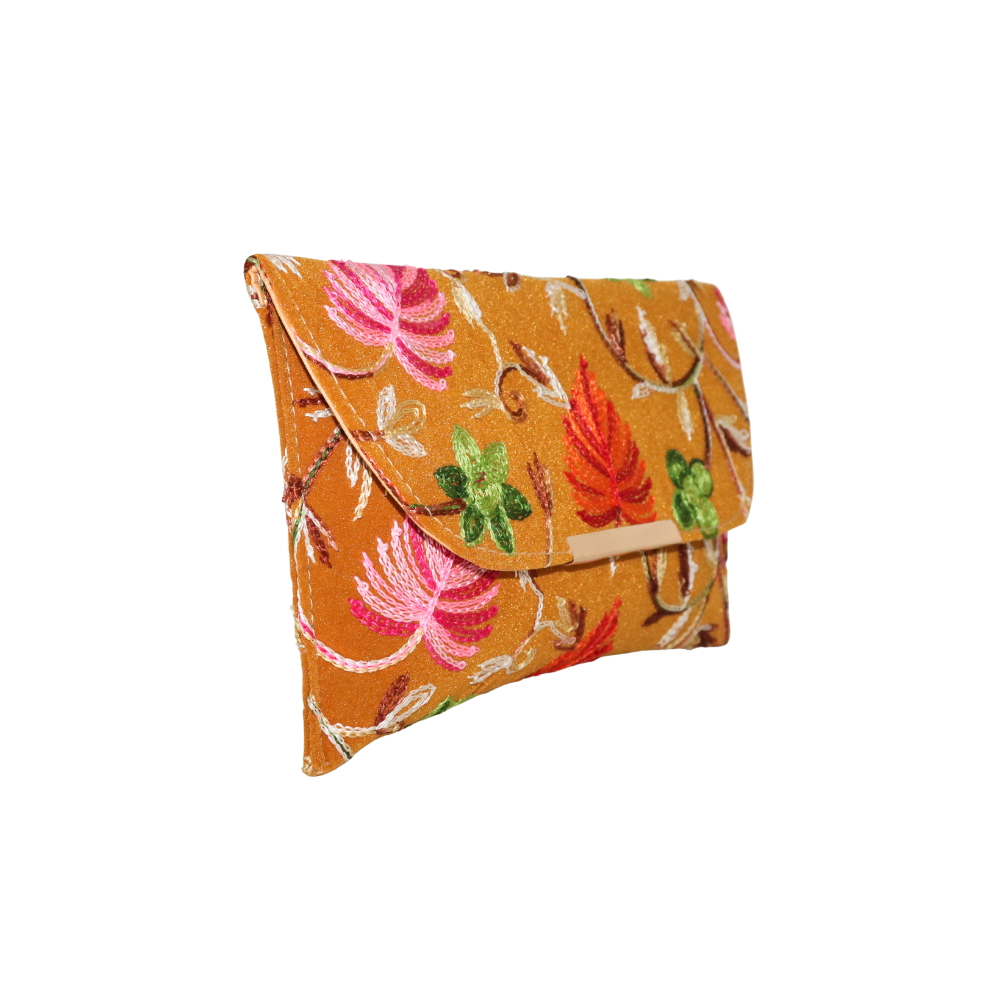 Bring a burst of color to your accessories collection with this stunning handmade cotton clutch, featuring intricate floral embroidery. The rich mustard yellow fabric beautifully complements the colorful flowers in shades of pink, red, and green, creating a fresh and vibrant design. Ideal for evening outings, weddings, or special events, this clutch is as stylish as it is practical. The soft cotton exterior and gold chain strap provide both comfort and elegance, while the compact size ensures you can easily carry your essentials such as a phone, makeup, and cards. This beautifully crafted clutch offers an elegant yet bold statement with its timeless floral motif. Handcrafted with care, this accessory adds a touch of luxury to any ensemble, making it the perfect finishing touch for your outfit.