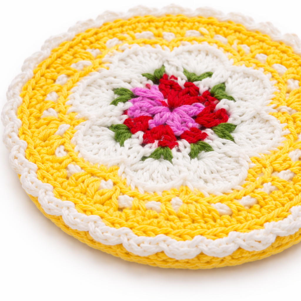 This handcrafted crochet doily coaster is made using soft cotton yarn and features a vibrant yellow outer crochet pattern with a decorative floral center design. The colorful flower motif combined with delicate crochet detailing creates a charming handmade table accessory. Both decorative and practical, this cotton yarn doily coaster protects table surfaces from heat, stains, and moisture while enhancing everyday table settings.