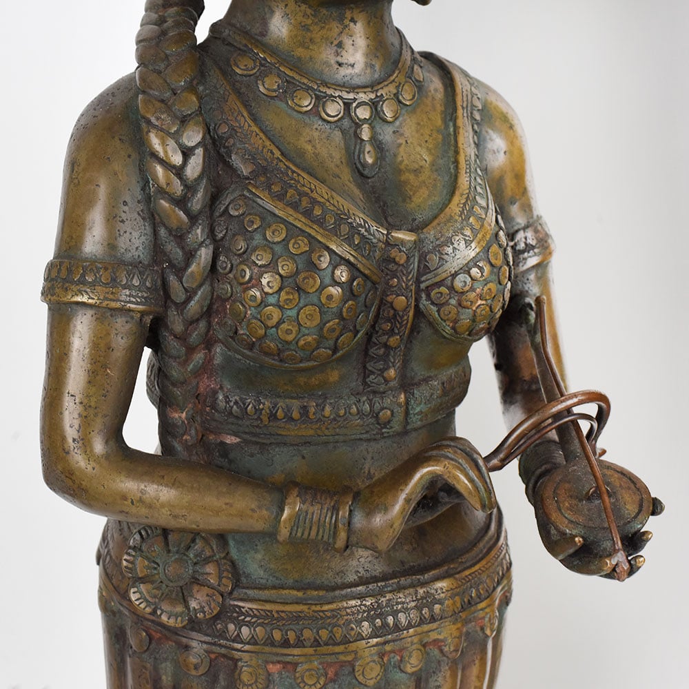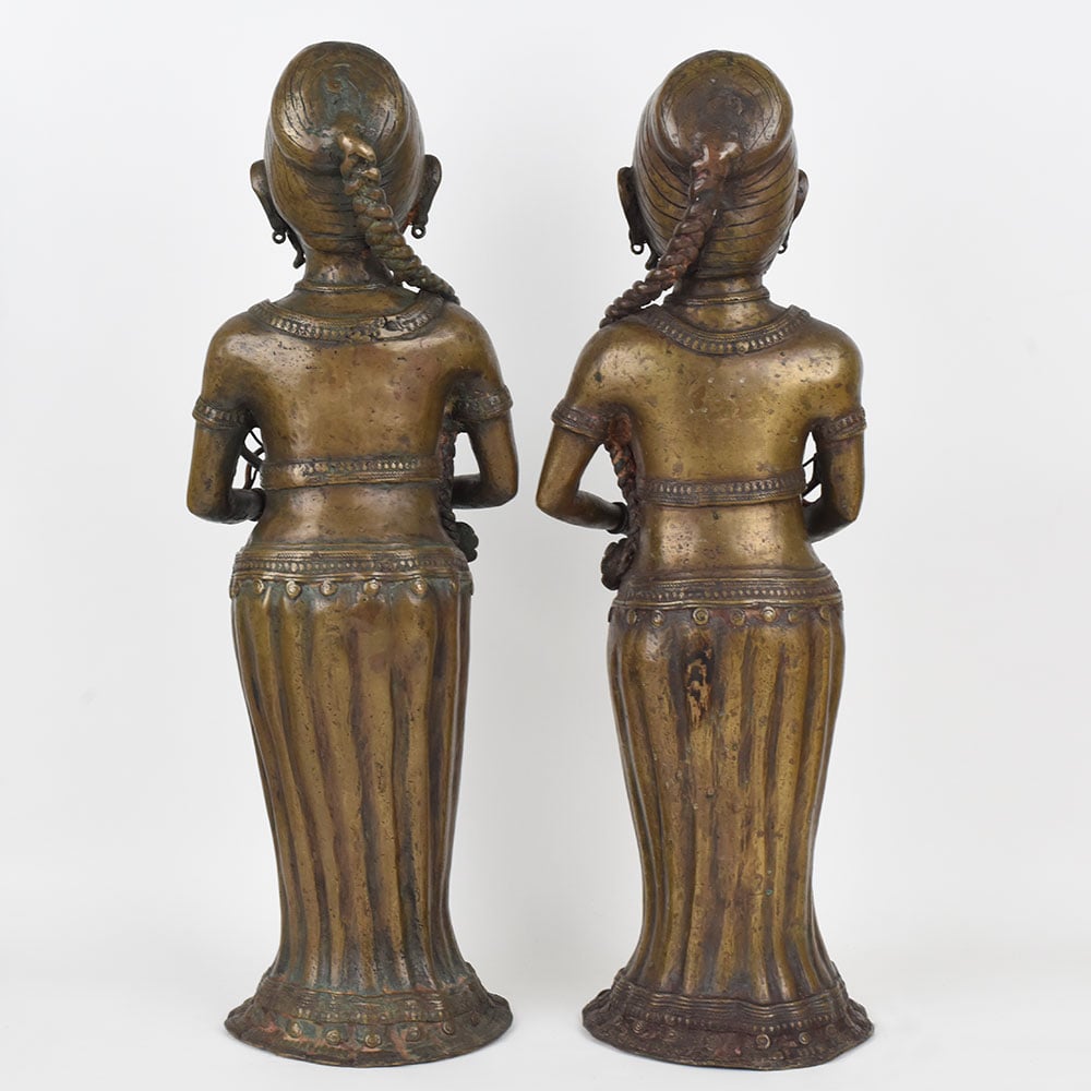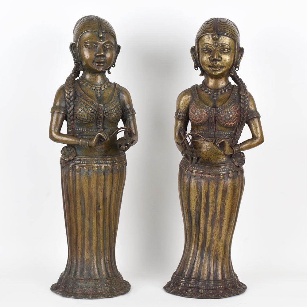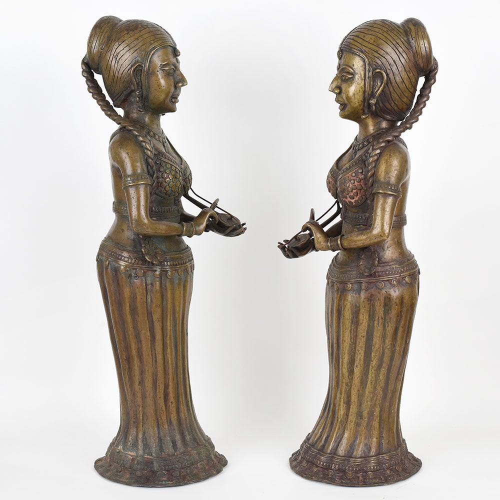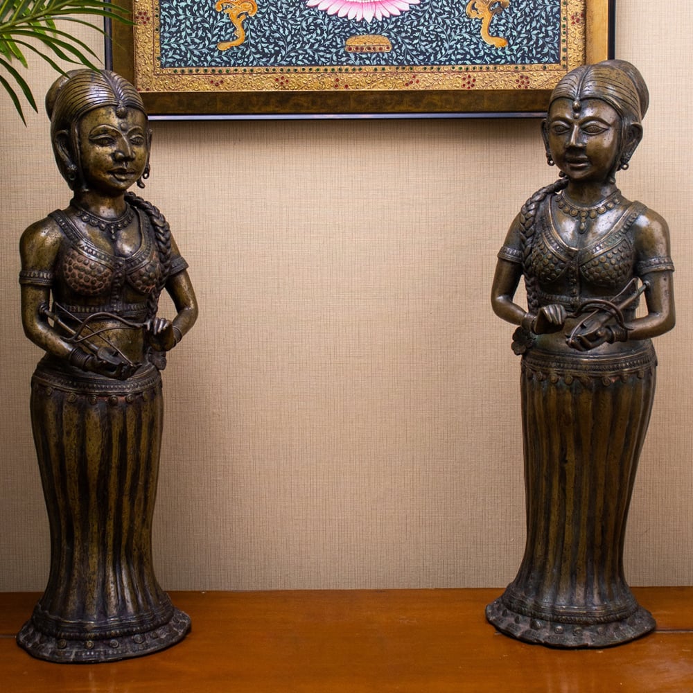 Celebrate the spirit of tribal heritage with this pair of vintage brass tribal lady statues, each captured mid-performance, playing traditional musical instruments. These stunning figures are more than decor—they’re a tribute to cultural rhythm and ancestral storytelling through music and dance. Expertly crafted from solid brass, each lady is adorned in traditional tribal attire, with intricate detailing on her jewelry, hair, and instrument. The pair exudes harmony and life, making them an exceptional centerpiece for collectors and lovers of ethnic art.