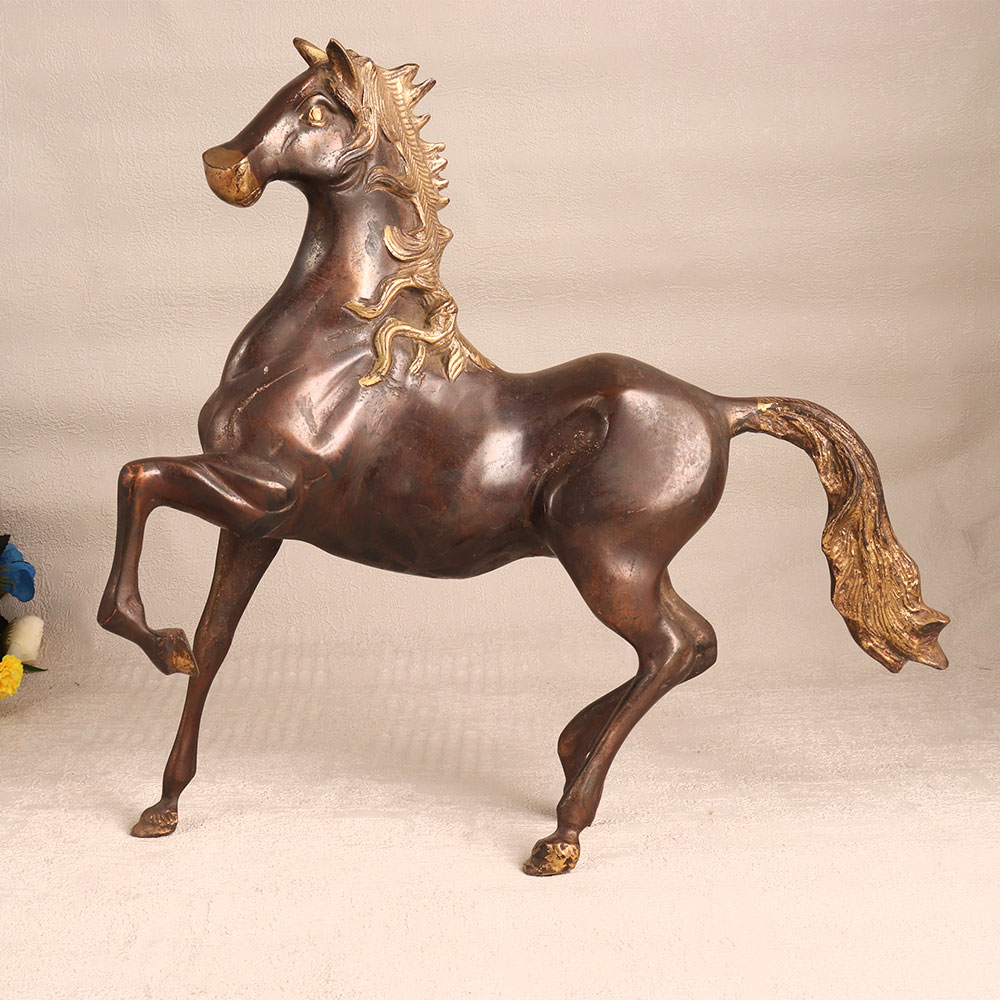 A brass statue of a regal horse that is meticulously crafted by skilled artisans in the European Art tradition. This exquisite piece boasts a lustrous antique brown finish that exudes a timeless charm, making it a stunning addition to any setting. Standing proudly on its pedestal, this handcrafted masterpiece showcases the unparalleled craftsmanship of its creators. The use of high-quality brass not only ensures its enduring beauty but also captures the fine details of the horse's form, from its majestic mane to the delicate curves of its muscles. Versatile and alluring, this brass horse statue can grace your home, office, hotel, cafe, shop, or restaurant, enhancing the ambiance with its classic allure. Whether you're a connoisseur of vintage collections or an aspiring curator, this masterpiece can be a focal point of your exhibition. Furthermore, it makes for an exceptional gift, perfect for expressing love and best wishes on special, festive, or auspicious occasions.