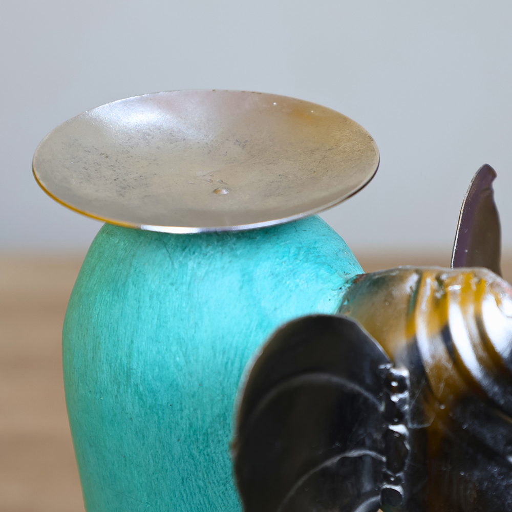 Celebrate Indian artistry with this set of three elephant candle holders hand-carved from wood and finished with gleaming metal faces. The pastel-hued bases in green, aqua, and lilac evoke playful elegance, while the metal elephant heads lend a folk-art charm that captivates. Ideal for decor enthusiasts, gift-givers, and collectors seeking color-infused accents. Packed & quality-checked by Indianshelf.