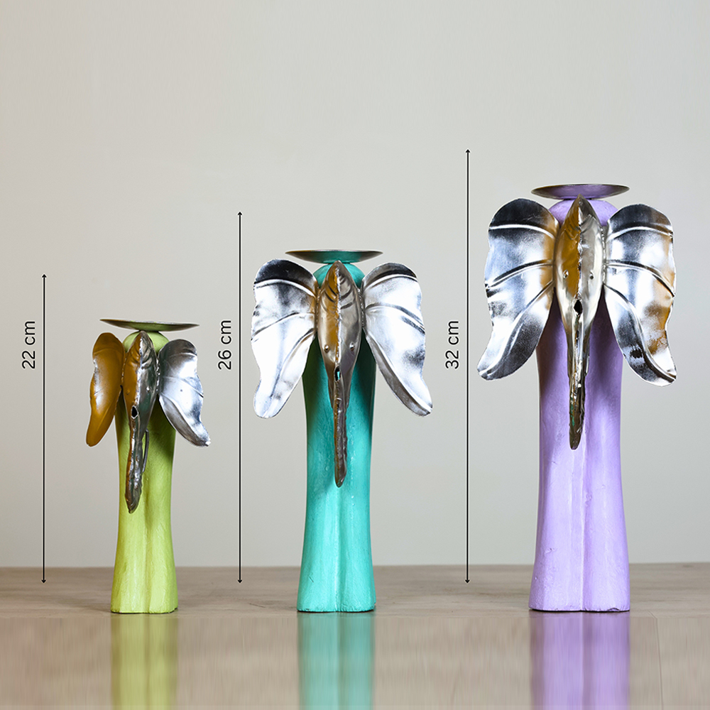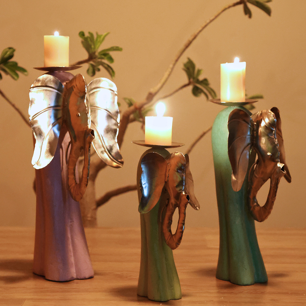 This set contains three candle holders in complementary pastel colours, each with a metal elephant face.