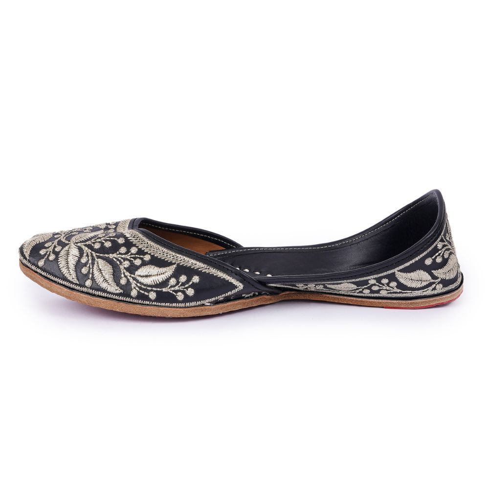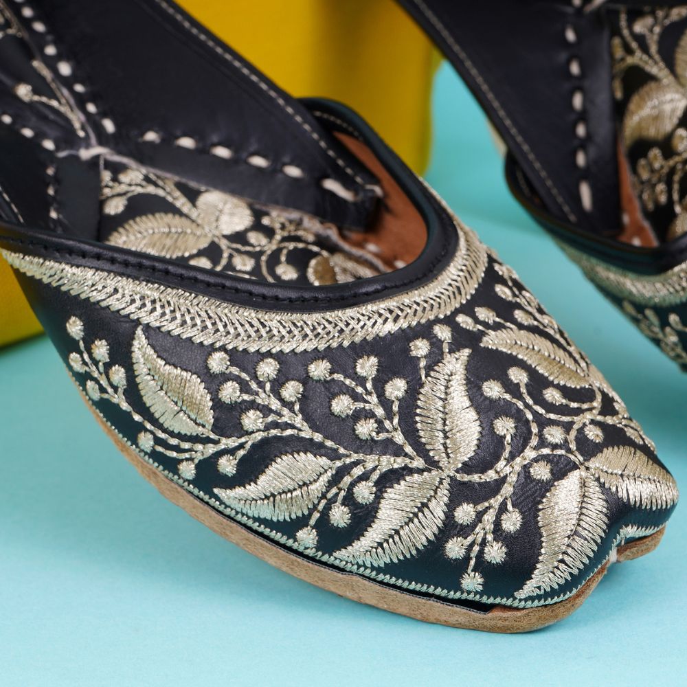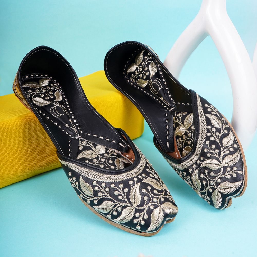 This jutti unites embroidered design with golden, embroidered, rexin, leather craftsmanship in a black, beige palette. Created for gifters, it enhances personal style or makes a memorable gift. Packed and quality checked by Indianshelf. Each piece is uniquely crafted by skilled artisans.