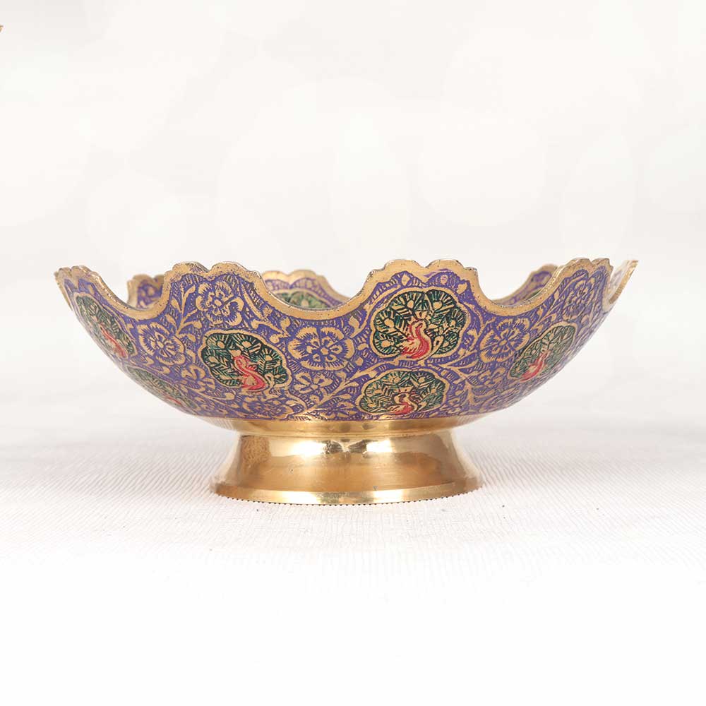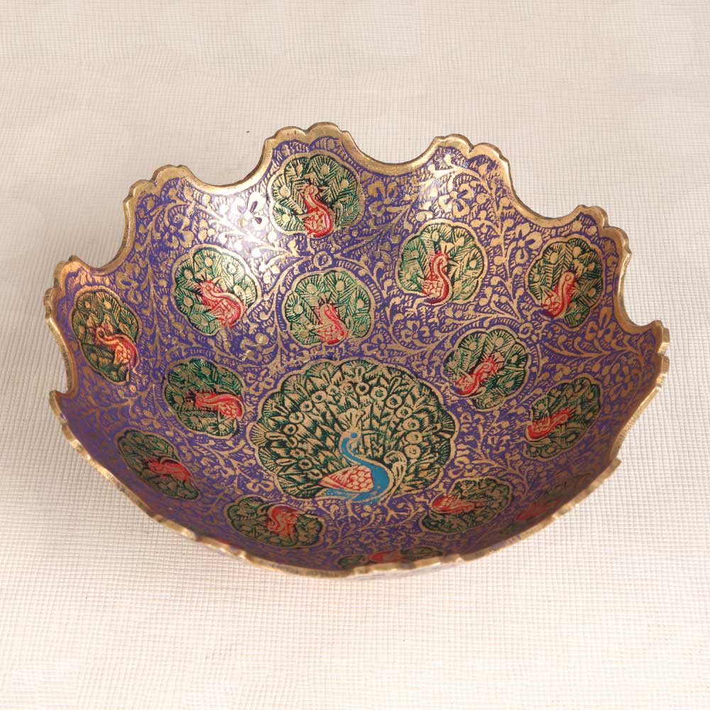 Mesmerize your guests with the exotic beauty of the Jaipur Brass Peacock Fruit Bowl. This stunning centerpiece features intricate peacock carvings and pops of color from traditional enamel work. The regal peacock design gives this bowl an air of luxury. The brass construction ensures it will maintain its shine for years to come. Place this bowl on your dining table, coffee table or kitchen island to add an exotic touch. The colored accents and textured carvings are sure to spark conversation. This bowl is perfect for those looking to add a touch of Indian flair to their home decor. Display your fruits and other items with pride, knowing this bowl makes a statement. Your guests will be mesmerized by the traditional craftsmanship of the Jaipur artisans who meticulously designed this showstopping piece.
