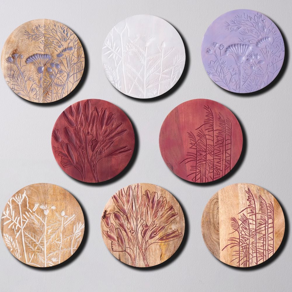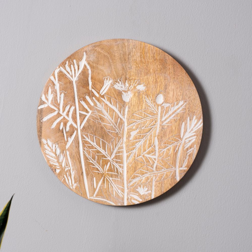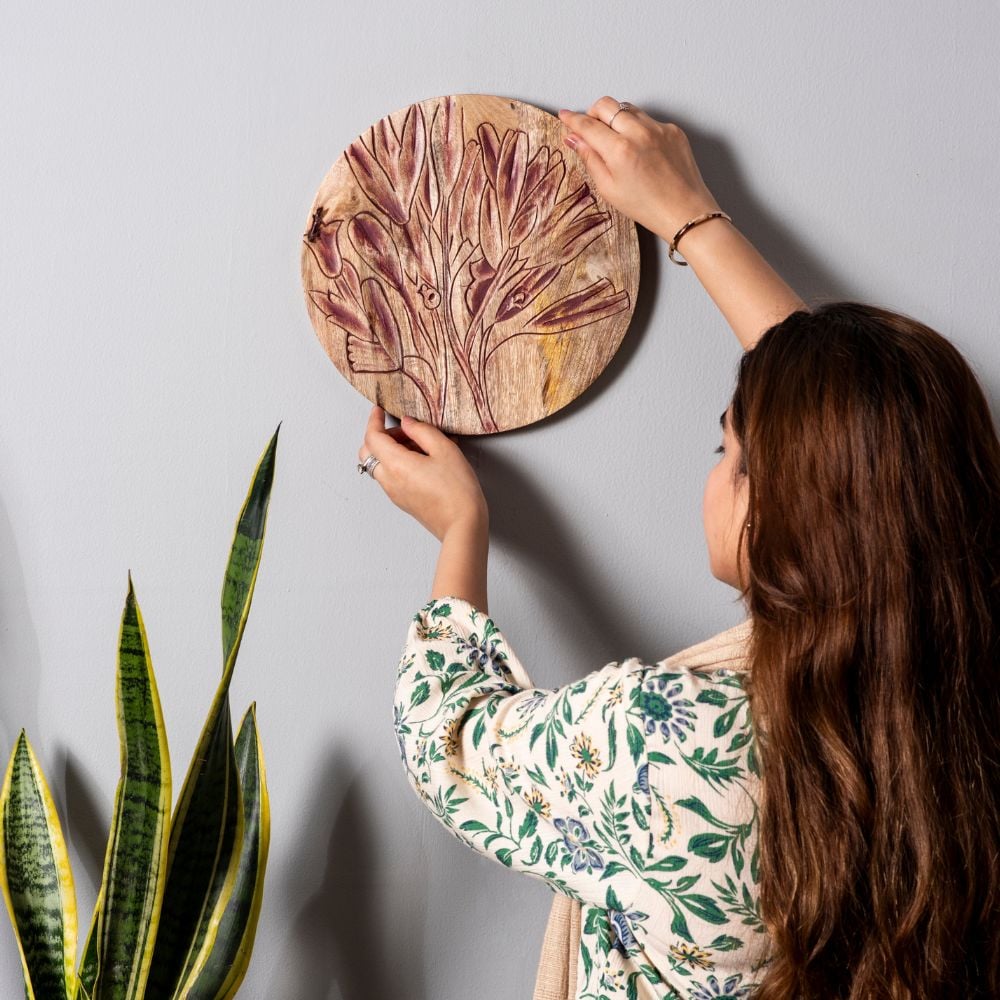 Enhance your interiors with this set of 8 handcrafted wooden wall plates featuring elegant floral and botanical etchings. The collection combines two red, two muted pink, and four white matte-finished plates, creating a perfect balance of boldness and subtlety. Packed & quality-checked by Indianshelf.