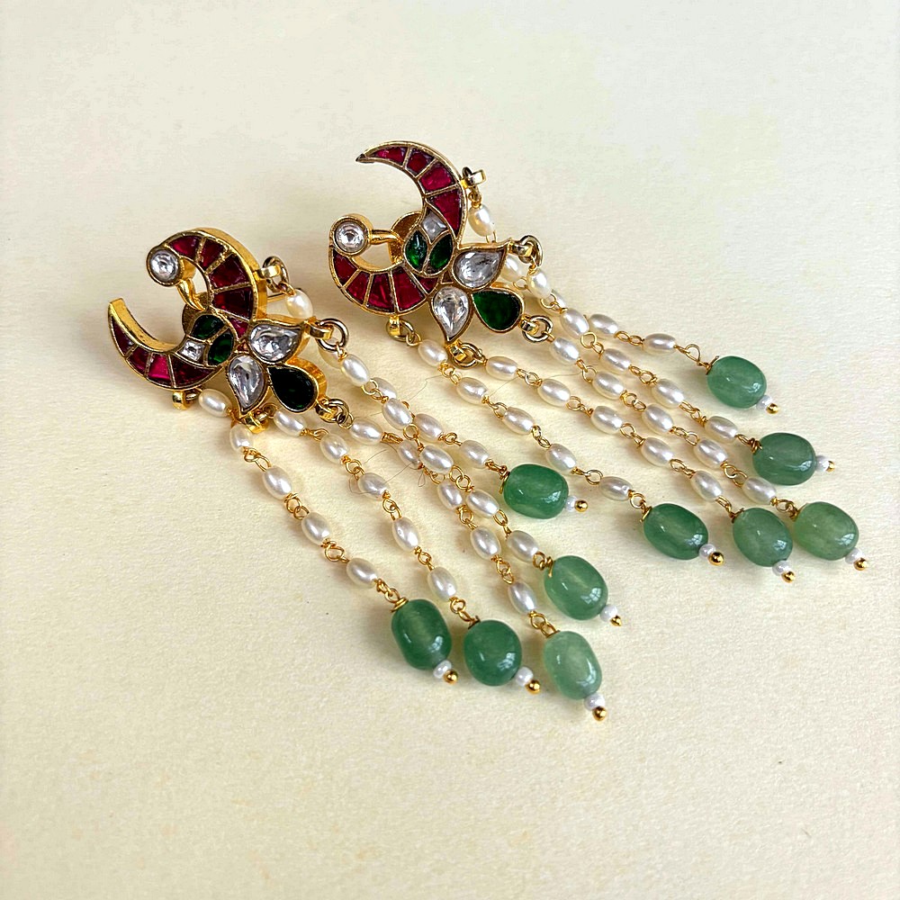 These handcrafted ethnic pearl cluster earrings are designed to move with expression and meaning. Built on a sturdy brass base, the clustered pearls come alive in rich multicolor accents that echo festive rituals and folk ornamentation. The elongated 6.70-inch form adds drama without heaviness, making each turn of the head feel intentional. They feel ceremonial, expressive, and deeply rooted in ethnic artistry.
