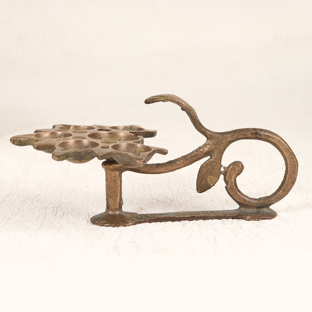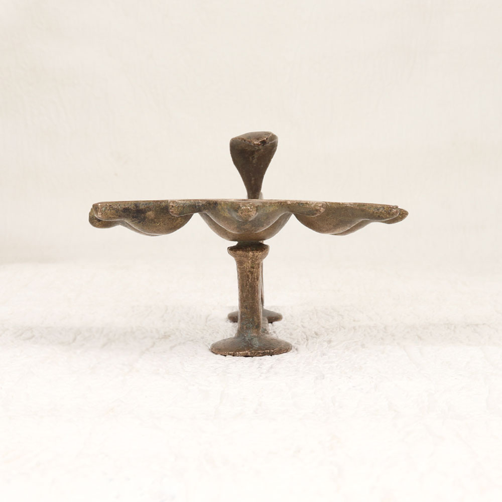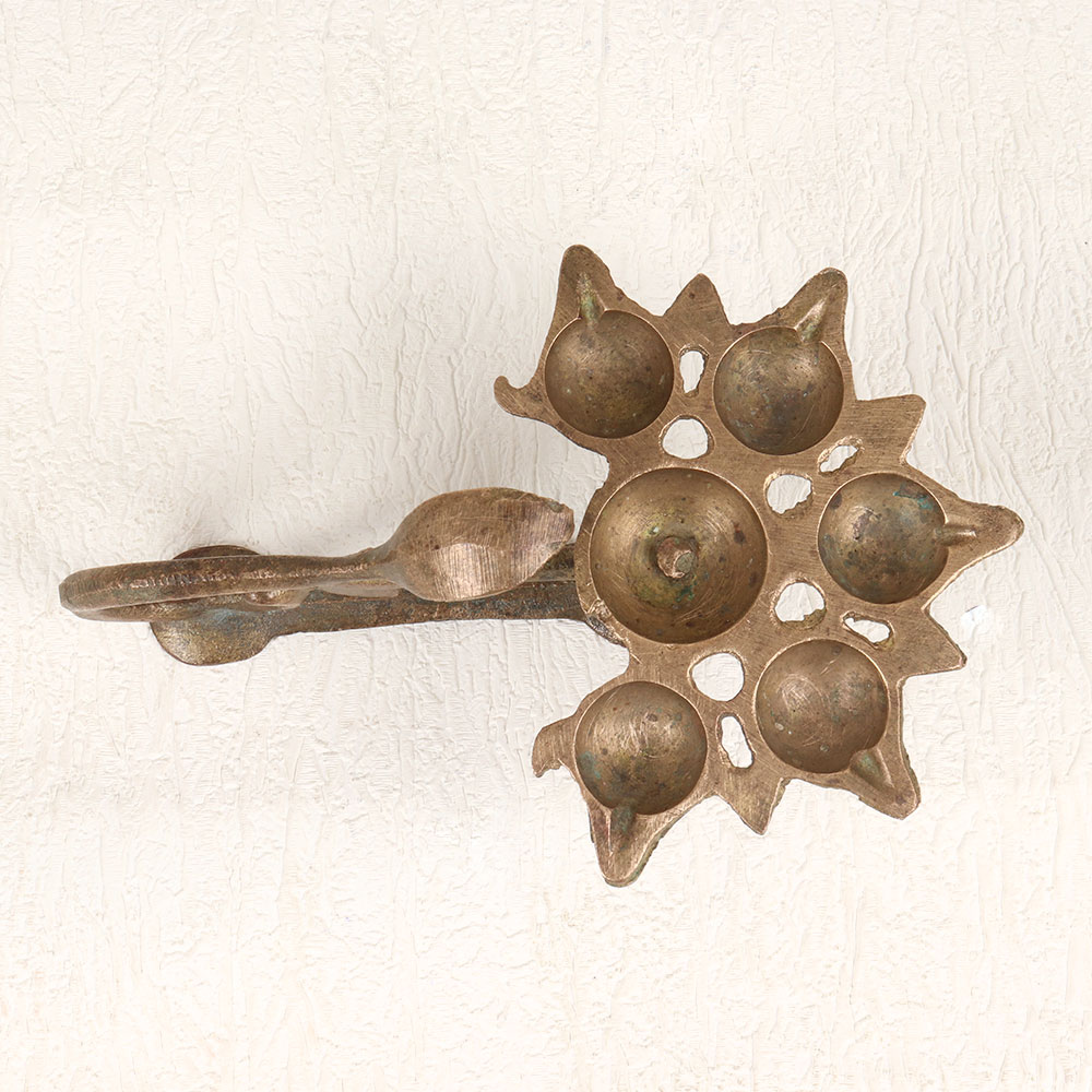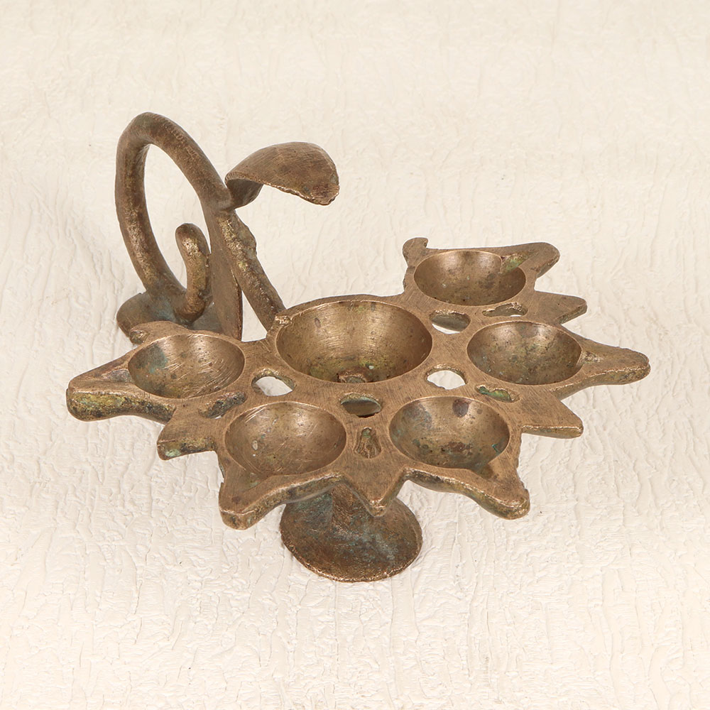 Enhance your sacred spaces with the timeless charm of our Vintage Brass Aarti Oil Lamp. Handcrafted by professional Indian artisans, this exquisite piece showcases the artistry and craftsmanship of a bygone era. The lamp is forged from high-quality brass, ensuring durability and a radiant luster that only improves with age. Adorned with a distinctive cobra handle, the lamp features six jyots, each ready to be illuminated using traditional fuels such as mustard oil or ghee. The antique brown finish adds a touch of antiquity, making it a perfect addition to any home, office, restaurant, hotel, or café prayer room. Its versatile design seamlessly blends with both contemporary and traditional decor, making it an ideal piece for those with a penchant for vintage aesthetics. Beyond its aesthetic appeal, this Aarti Oil Lamp holds cultural significance and serves as a cherished item in any vintage collection. Share the warmth of tradition by gifting it to your loved ones on special, festive, or auspicious occasions.