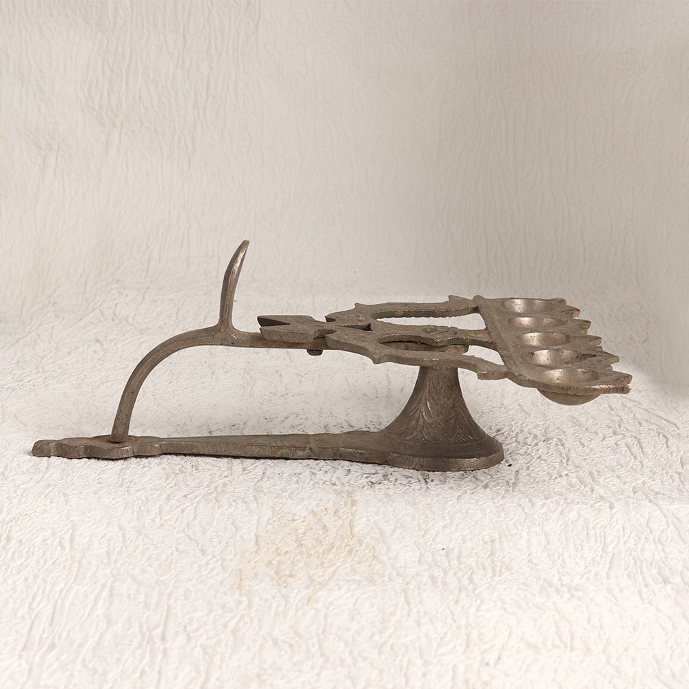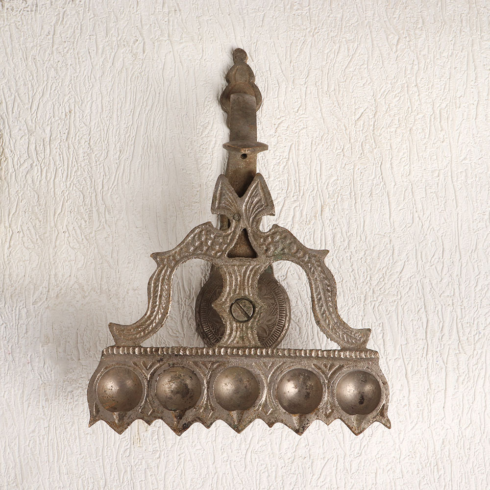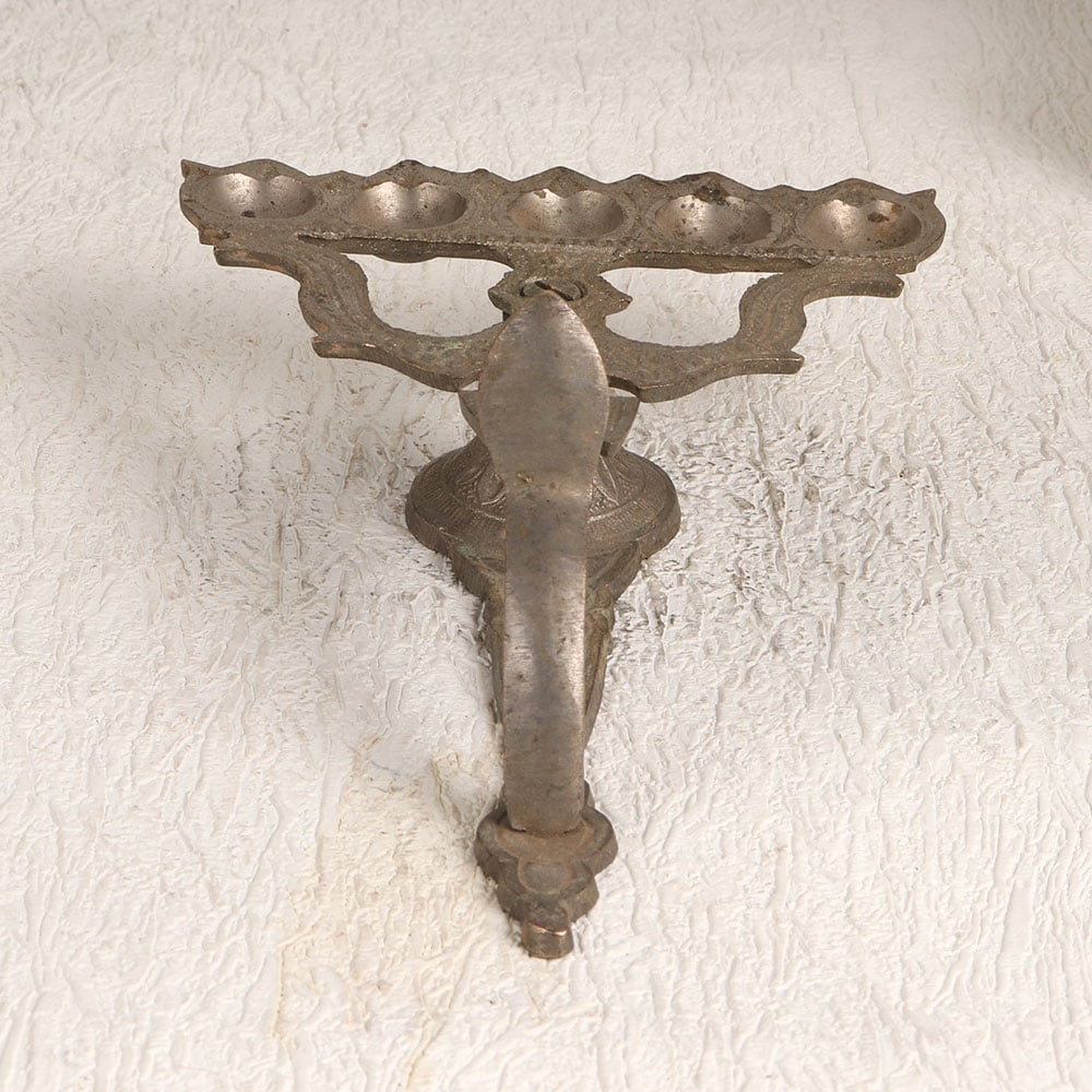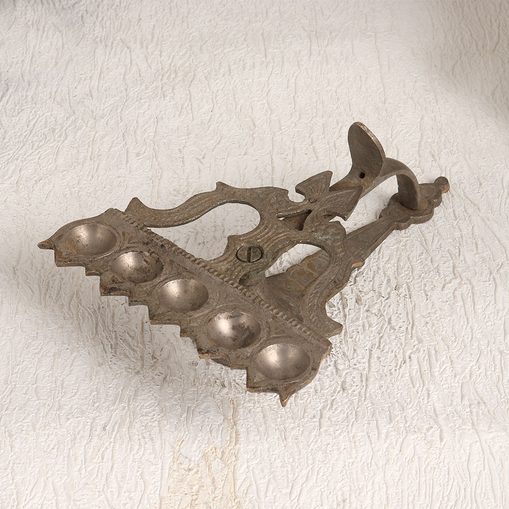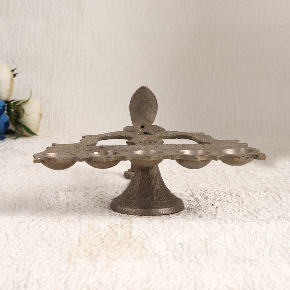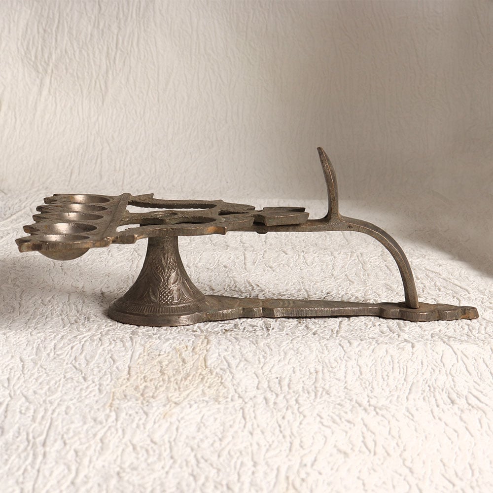 A Vintage Brass Aarti Oil Lamp that features a distinctive cobra handle and a rich antique gray finish. Handcrafted by talented artisans from high-quality brass, this lamp is a true work of art that seamlessly blends tradition and elegance. This exquisite piece can be a captivating addition to your home, office, restaurant, hotel, cafe, or shop, enhancing the ambiance with its exquisite craftsmanship. Its practical and symbolic purpose makes it perfect for both decoration and use during prayer, rituals, and auspicious occasions. The lamp accommodates up to five jyots, which can be lit using either mustard oil or ghee with cotton wicks. This versatile feature ensures that it is not just a visual delight, but also a functional item for religious ceremonies. Moreover, our Vintage Brass Aarti Oil Lamp is a remarkable addition to any vintage collection, exuding a sense of nostalgia and cultural heritage. It can also serve as a heartfelt gift for your loved ones on special, festive, or auspicious occasions, carrying with it the warmth of tradition and the artistry of skilled craftsmen.
