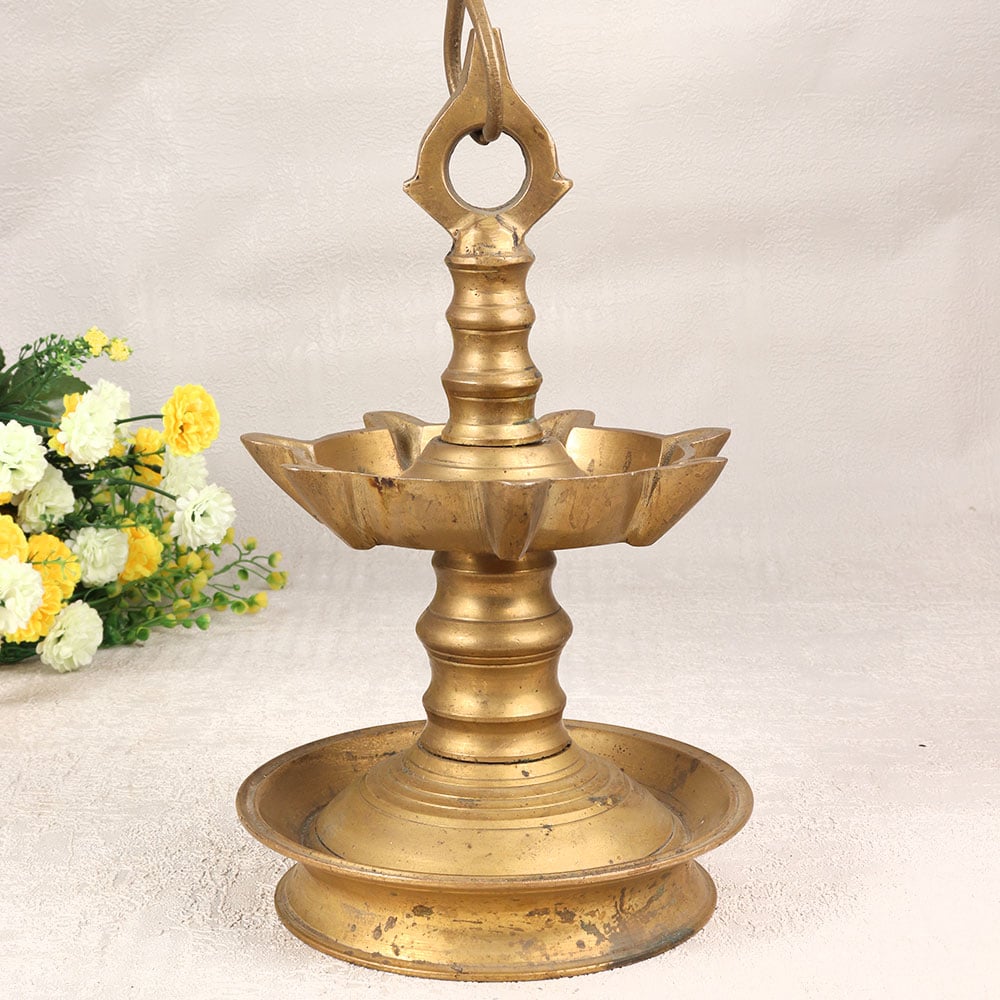 Enhance your sacred spaces with the grandeur of our Vintage Brass Hanging Oil Lamp that is a testament to the craftsmanship of talented Indian artisans in the revered South Indian Art tradition. This magnificent piece features an intricate design, meticulously handmade from high-quality brass, boasting a rich antique brown finish that exudes timeless elegance. The lamp is suspended gracefully from a sturdy chain and hook, creating a captivating visual spectacle. Adorned with seven jyots, this ornate creation allows you to illuminate your surroundings with the warm glow of tradition. Fueled by the purity of mustard oil or the sacred essence of ghee, the lamp's cotton wicks provide a serene ambiance, perfect for prayer in temples or enhancing the spiritual atmosphere in your home. Versatile in its application, this vintage masterpiece is a striking addition to any setting, be it your home, office, restaurant, hotel, or cafe. Embrace the cultural richness and aesthetic charm as you make this exquisite piece a focal point in your space or an exquisite gift for your loved ones during special, festive, or auspicious occasions.