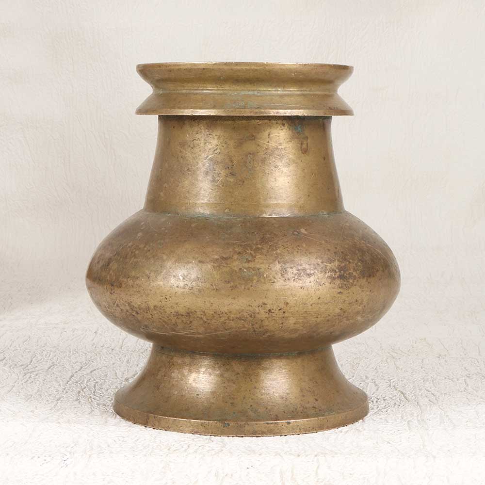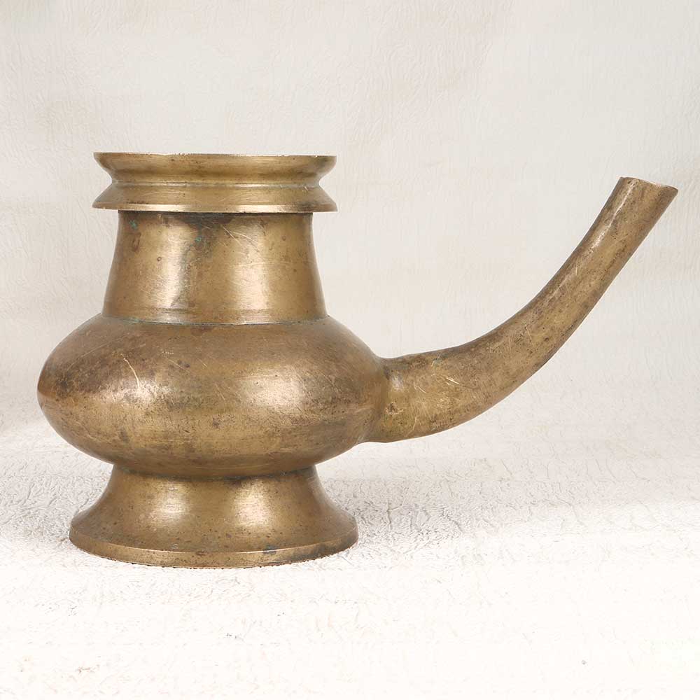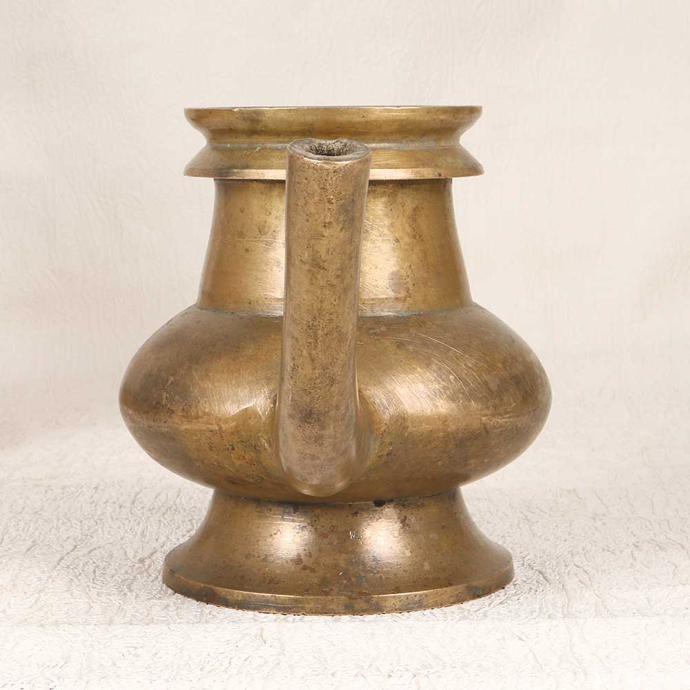 Cleanse your spirit with this ornate brass holy water pot. Crafted in a traditional South Indian style with elegant floral motifs and a graceful spout, this vintage vessel elevates a sacred ritual. Bring spiritual comfort into your home with this special vessel designed to hold and dispense holy water. The vintage brass will develop a lovely patina with use, adding to its timeless beauty. Simple yet striking, this pot is perfect for those who appreciate spiritual rituals and meaningful home decor accents. Place it by your door to bless those who enter, or bring it to your place of worship to share its sacred contents. Crafted by artisans honoring ancient traditions, this holy water pot connects you to something larger than yourself. Its graceful presence will add beauty and meaning to your personal rituals.