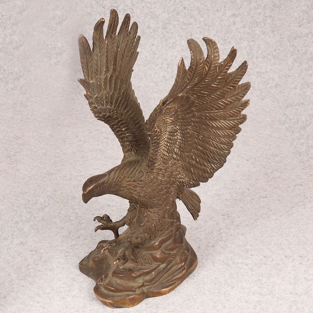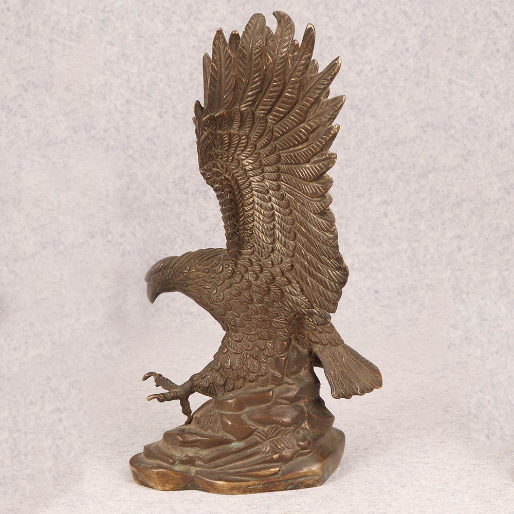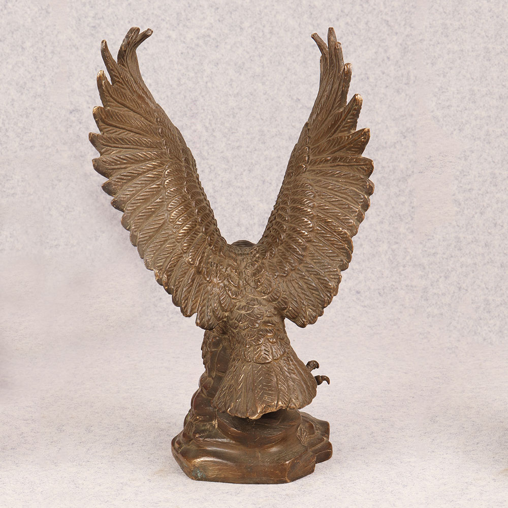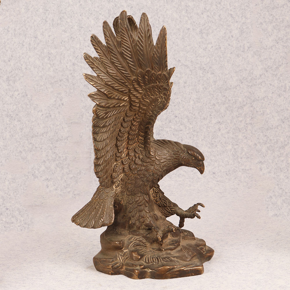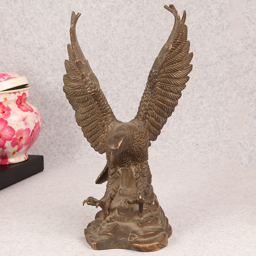 Behold the majestic embodiment of strength and grace in the form of our brass eagle statue, poised in a fearless attacking stance upon a platform. Meticulously crafted by talented Indian artisans, this exquisite masterpiece showcases the unparalleled artistry that comes from generations of expertise. The statue's antique brown finish adds a touch of timeless elegance, highlighting the intricate details that bring the noble creature to life. Handmade from high-quality brass, this awe-inspiring eagle statue is a symbol of power and freedom, making it a perfect addition to any space. Whether adorning your home, office, restaurant, hotel, or cafe, its commanding presence captivates attention and elevates the ambiance. Embrace the spirit of vintage charm by incorporating this striking piece into your collection, and watch as it becomes a focal point of admiration. Versatile and meaningful, this brass eagle statue serves as an exceptional gift for your loved ones on special, festive, or auspicious occasions. Its symbolic representation of strength and courage makes it a thoughtful gesture that resonates with both personal and professional connections.