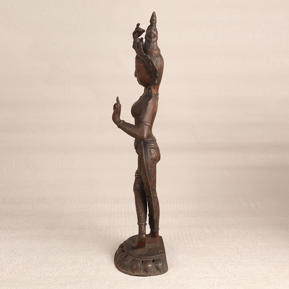Elegance and divinity converge in this exquisite brass statue of Goddess Lakshmi, beautifully captured in a graceful dance on a raised platform. Handcrafted by highly skilled and experienced Indian artisans, this masterpiece exudes timeless charm with its antique dark finish. Standing at the intersection of artistry and spirituality, this statue is a testament to the rich craftsmanship traditions of India. Crafted from high-quality brass, it radiates a warm and inviting aura, making it a versatile addition to your surroundings. Whether it graces your home, office, hotel, cafe, shop, or restaurant prayer room, it carries an air of reverence and opulence. Beyond its spiritual significance, this statue is a stunning decor piece that complements any setting, be it contemporary or traditional. It also makes a striking addition to vintage collections or exhibition displays, showcasing the artistry of Indian culture. Furthermore, it serves as an extraordinary gift for loved ones during special, festive, or auspicious occasions, imparting blessings, prosperity, and a touch of artistic grandeur.